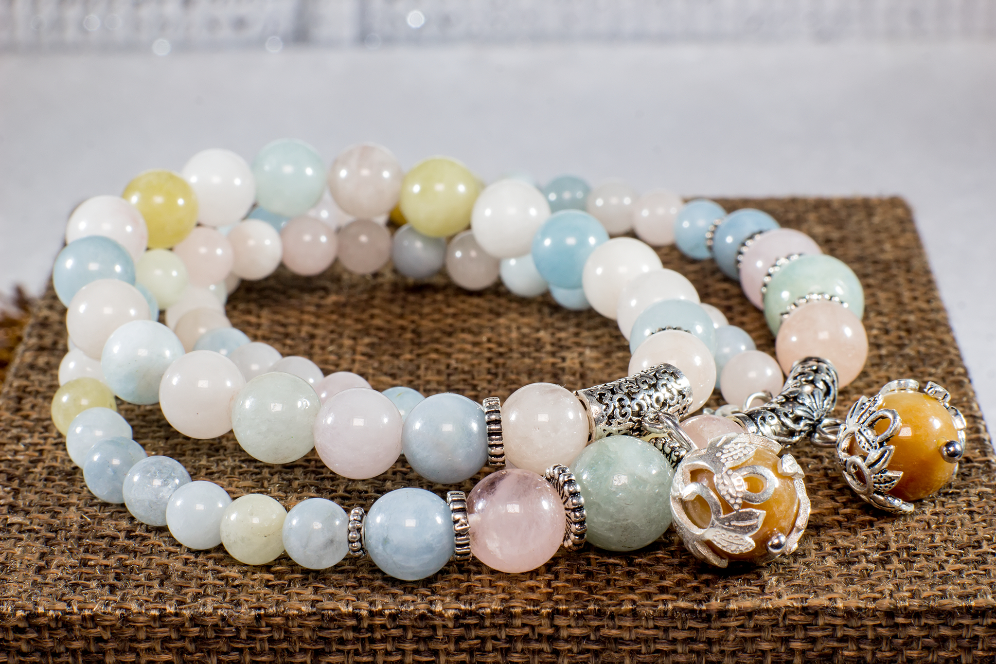 Một chiếc vòng tay với 20 viên đá Beryl đa sắc thiên nhiên 8mm mang màu pastel nhẹ nhàng, thêm 1 viên cẩm thạch (Jadeite) lem huyết tự nhiên được bọc bạc 92.5 tinh xảo, mix với bộ charm bạc 92.5% nhẹ nhàng, quý phái, lắc nhẹ theo từng cử động nhỏ của bạn, thu hút mọi ánh nhìn.