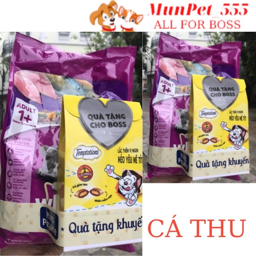 🍒 THÔNG TIN SẢN PHẨM - có 3 hương vị: cá biển, cá thu, cá ngừ - Khối lượng tịnh: 1.2kg - Nguyên liệu: Ngũ cốc (gạo, bắp, bột mỳ), Protein động vật (thịt gia cầm và các phụ phẩm từ gia cầm), Protein thực vật (tinh bột bắp, tinh bột đậu nành), Dầu và chất béo (Stearin cọ, dầu nành), Vitamin và các loại khoáng chất, cá biển, bột mì, muối iot, taurine, Methionine, hương liệu tổng hợp, hương cá biển.