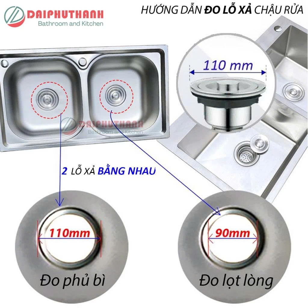 Loại Inox dùng cho chậu 2 hộc đôi, có 2 LỖ XẢ BẰNG NHAU, đo phủ bì phi 110 (lỗ xả chậu lọt lòng 90)