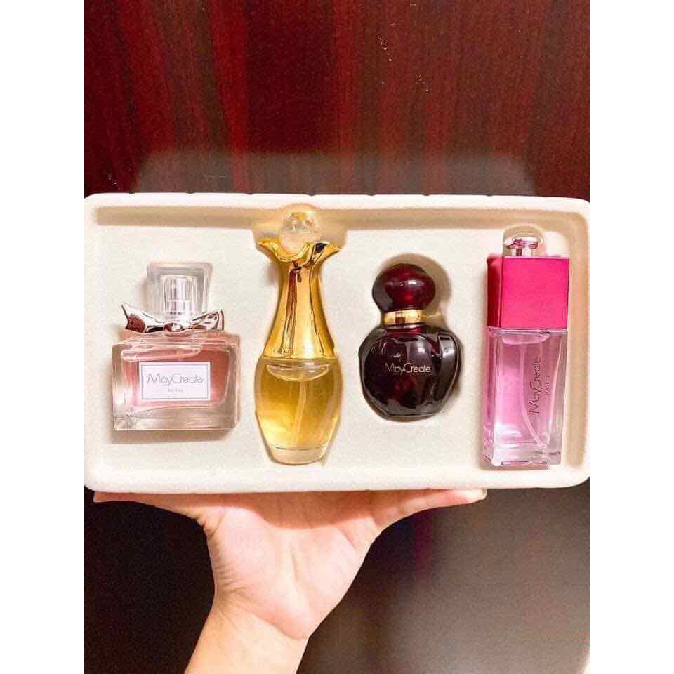 Set 4 Lọ Nước Hoa Nữ Maycreat Ngọt Ngào Quyến Rũ - Mỗi combo gồm 4 chai nước hoa: mỗi chai 25ml - thơm cực kỳ và bám mùi lâu - Hồng phấn: Ngọt ngào, tươi mới - Vàng: Sang trọng quý phái - Tím mê hoặc: Thần bí, quyến rũ - Tím nhạt: ưu nhã động lòng người - Sang trọng và tinh tế. - Thiết kế chai sang trọng, tinh tế dạng mini để có thể dễ dàng mang theo bên mình. - Hộp trắng tinh khiết sang trọng, thắt nơ, thích hợp làm quà tặng. - Mùi hương nồng nàn giúp các cô gái luôn tự tin và nổi bật ở bất cứ đâu 🌹🌹Là con gái đừng tiếc tiền mua 1 thỏi son, 1 lọ kem dưỡng da, 1 bộ váy mình thích hay đơn giản là 1 lọ nước hoa! 🌹🌹 Thanh xuân chỉ có một lần🌹 👉Không tận hưởng thì còn đợi đến bao giờ đây? + Bạn là con trai đang muốn tặng cho bạn gái một món quà bất ngờ, Set nước hoa này là sự lựa chọn tuyệt với shop chắc chắn các chị em sẽ rất thích và càng yêu bạn hơn