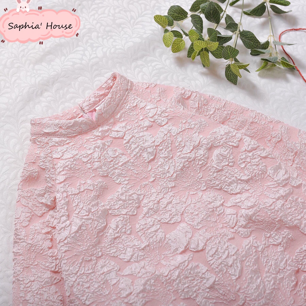 Thiết kế trên nền GẤM DỆT HOA ĐÀO NỔI đặc trưng của ngày Tết, cầu mong cho mọi điều thuận lợi bình an. Áo sét cùng mấn đơn cùng màu hài hòa.