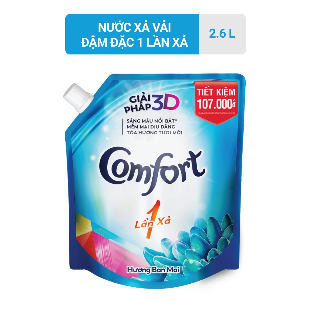 NƯỚC XẢ VẢI COMFORT CÁC LOẠI:_x000d_ Nước xả vải Comfort sở hữu công thức đột phá mới với hạt lưu hương kép giúp loại bỏ mùi hôi trên quần áo, bung tỏa những làn hương tươi mát, sảng khóai và thơm lâu đến tận cuối ngày cho bạn tận hưởng cảm giác tuyệt vời ngay cả khi mặc và thổi bùng trong bạn niềm lạc quan yêu đời. _x000d_ _x000d_ 1. Nước xả vải Comfort Một Lần Xả Hương Ban Mai_x000d_ 2. Nước xả vải Comfort Một Lần Xả Hương Gió xuân_x000d_ Bạn có biết Comfort 1 lần xả tiết kiệm nước như thế nào? Theo thống kê từ Bộ Tài Nguyên Môi Trường, trung bình cứ 1 trong 3 người Việt Nam lại thiếu nước sạch sinh hoạt để dùng. Trong khi đó, chúng ta lại đổ đi trung bình 30L nước cho mỗi lần giặt xả. _x000d_ _x000d_ Comfort 1 lần xả được ra đời với công thức cắt bọt và chống tái bám giúp áo quần hoàn toàn sạch bọt xà phòng chỉ trong 1 lần xả, giúp bạn tiết kiệm 70% lượng nước giặt giũ, tương đương 20L nước sạch và còn cả thời gian, công sức cho chính bản thân._x000d_ _x000d_ 3. Nước xả vải Comfort Đậm Đặc Hương Ban Mai_x000d_ Nước xả vải Comfort Đậm Đặc Hương Ban Mai sở hữu công thức đột phá mới với hạt lưu hương kép giúp loại bỏ mùi hôi trên quần áo, bung tỏa những làn hươgn tươi mát, sảng khóai và thơm lâu đến tận cuối ngày cho bạn tận hưởng cảm giác tuyệt vời ngay cả khi mặc và thổi bùng trong bạn niềm lạc quan yêu đời. _x000d_ _x000d_ Hướng dẫn sử dụng _x000d_ GIẶT MÁY: dùng 1 nắp cho 4-5kg quần áo. Hòa Comfort Đậm Đặc Một lần xả vào ngay nước xả đầu tiên. Không cần xả thêm với nước._x000d_ GIẶT TAY: dùng ½ nắp cho 10-15 chiếc quần áo trong 10 lít nước. _x000d_ 1. Sau khi giặt với bột giặt, vắt quần áo cho bớt bọt. _x000d_ 2. Hòa Comfort Đậm Đặc Một lần xả vào nước, đảm bảo lượng nước đủ ngập hết quần áo. _x000d_ 3. Ngâm quần áo 10-15 phút. _x000d_ 4. Vắt và phơi khô. Không cần xả thêm với nước. Không đổ trực tiếp lên quần áo. Để đạt kết quả tốt nhất cho đồ jean, chăn màn, khăn mặt, … hãy dùng thêm 1 nắp nước xả vải. _x000d_ Lưu ý: Để xa tầm tay trẻ em. Rửa sạch bằng nước nếu bị dây vào mắt. Bảo quản sản phẩm ở nơi thoáng mát và tránh ánh nắng trực tiếp._x000d_ _x000d_ HSD: Sử dụng tốt nhất trong vòng 15 tháng kể từ ngày sản xuất in trên bao bì_x000d_ Xuất xứ: Việt Nam_x000d_ Bao bì thay đổi theo từng đợt nhập hàng._x000d_ _x000d_