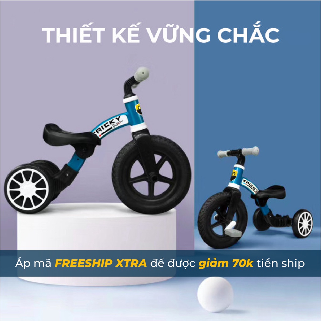 • 3 kiểu xe trên một sản phẩm: Khi làm xe chòi chân thăng bằng thì tháo bàn đạp ra điều chỉnh 2 bánh sau gần nhau. Khi làm xe chòi chân thông thường thì tháo bàn đạp ra điều chỉnh 2 bánh sau xa nhau. Khi làm xe đạp 3 bánh cho bé thì điều chỉnh bánh sau xa nhau càng thêm chắc chắn cho bé khi đi trên đường • Xe đạp tích hợp xe chòi chân cho bé Loại bánh xe xốp siêu chắc chắn và bền bỉ • Xe có ba bánh xe giúp cân bằng cho bé khi đi • Chống các tác động của ngoại cảnh như mưa gió nắng,.... • Bánh xe với cách rãnh sâu và chất liệu chống trơn trượt • Thiết kế tay lái bọc cao su có độ ma sát cao, bé cầm tay lái thêm chắc chắn • Yên xe có thể điều chỉnh độ cao phù hợp, (có 2 độ cao) • Độ xa của bàn đạp vừa phải giúp bé đạp xe duỗi chân thoải mái cho bé • Bàn đạp có thiết kế với các rãnh chống trượt thêm an toàn cho bé khi sử dụng • Yên xe lớn và có dạng trũng giữa an toàn hơn cho bé, không lo trượt khỏi yên khi vui chơi • Hai bánh xe sau có thể điều chỉnh độ xa tùy theo mục đich sử dụng • Khi làm xe chòi chân thì điều chỉnh bánh sau gần nhau • Khi làm xe đạp cho bé thì điều chỉnh bánh sau xa nhau càng thêm chắc chắn cho bé khi đi trên đường • Trọng lượng :3.5-4kg • Trọng lượng chịu lực : 30kg • Kích thước :65x37x53 • Độ tuổi 14 tháng-6 tuổi
