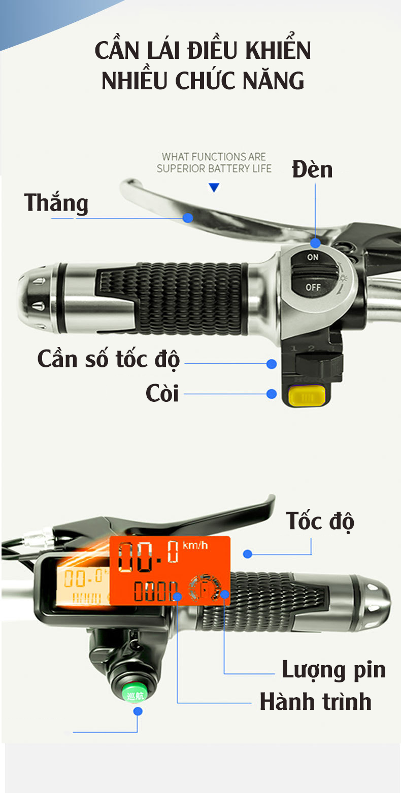 Giảm xóc kép trước sau/Màn hình LCD chuyển đổi thành 48V720wh15A, đi được khoảng 60 km.