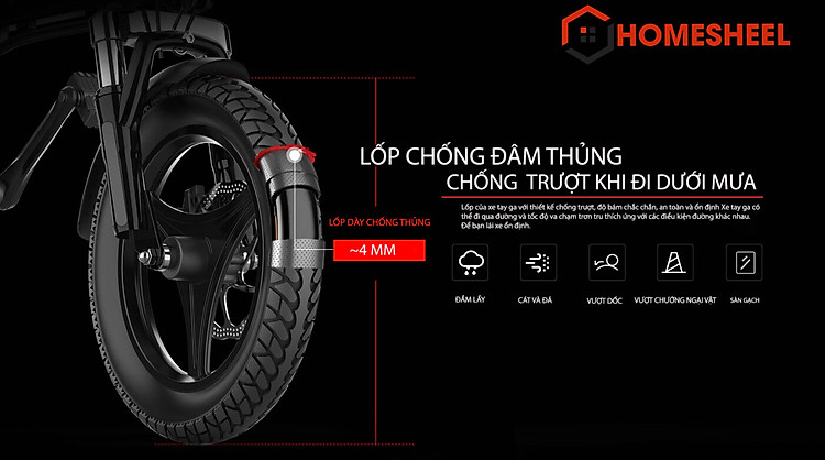 Lốp xe điện được thiết kế chống trượt, bám đường chắc chắn, an toàn và ổn định. Chiếc xe có thể băng qua đường và gờ giảm tốc một cách mượt mà.
