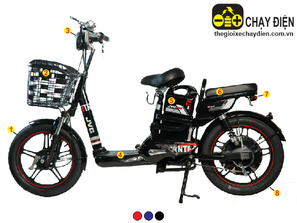 Bình ắc quy được đặt phía dưới yên trước Xe đạp điện JVC Winter có thiết kế bình ắc quy được đặt phía dưới yên trước với khả năng chứa 4 bình ắc quy nhỏ 48v12ah, với bình ắc quy này có thể giúp xe vận hành quãng đường từ 40 đến 50km cho 1 lần sạc đầy. Bình ắc quy có thời gian sạc đầy từ 6 đến 8 giờ, phía trên sạc có đèn báo chi tiết giúp người sử dụng có thể biết lúc nào là đầy. Hộp bình được đúc bằng nhựa nguyên khối, trang trí bằng tem nước phủ bóng, giúp chiếc xe trong nổi bật và ấn tượng hơn.
