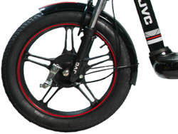 Bánh trước với vành đúc 5 chấu Xe đạp điện JVC Winter sử dụng bánh trước với vành đúc 5 chấu kép, với viền chỉ đỏ bao quanh tạo điểm nhấn nổi bật. Ở tâm của bánh xe là thắng cơ an toàn, được đồng bộ với tay thắng phía trên giúp người điều khiển dễ dàng làm chủ tốc độ trong quá trình vận hành. Giảm sóc êm ái nối liền cụm bánh trước với thân xe. |