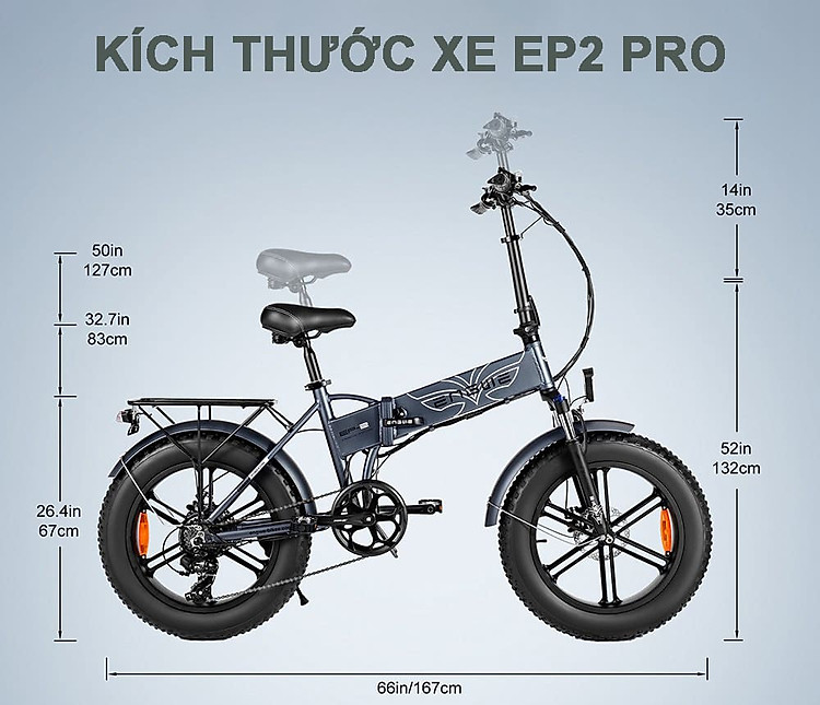 Xe đạp Engwe EP-2 Pro có thiết kế trẻ trung, nhỏ gọn, bắt mắt với nhiều phiên bản màu sắc khác nhau giúp bạn có thêm sự lựa chọn phù hợp về màu yêu thích, hợp mệnh với bản thân. Xe có kích thước tổng thể là 167 x 30 x 118cm và kích thước sau gấp gọn là 78 x 43 x 81cm. Trọng lượng của xe 37kg, cùng với thiết kế thông minh, giúp người dùng thuận tiện trong các thao tác gấp gọn, mở rộng trong vòng 10s để cất giữ để tiết kiệm không gian hoặc di chuyển. Phần tay lái và yên xe có thể tùy chỉnh độ cao linh hoạt tùy theo vóc dáng của người lái. Toàn bộ khung xe được đúc nguyên khối tăng khả năng tải trọng lên đến 150 và kích thước của xe thì đối tượng phù hợp để đi có chiều cao từ 145 – 195cm.