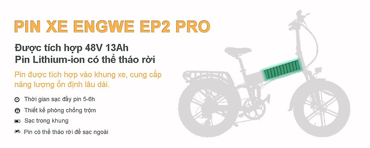 Xe đạp điện trợ lực EP-2 Pro sở hữu viên pin cao cấp có dung lượng 13Ah, sạc đầy trong vòng 6 tiếng, có thể đi được quãng đường từ 45km đến 100km (tùy vào chế độ bạn sử dụng và điều kiện địa hình). Ngoài ra, Khối PIN Lithium-ion 48V tiêu chuẩn cung cấp năng lượng ổn định và lâu dài. Bên cạnh đó, nhà sản xuất cải tiến phiên bản pin có thể tháo rời dễ dàng để sạc bên ngoài. Điều đặc biệt có ở con xe này có thiết kế phòng chống trộm cắp, bạn có thể an tâm hơn trong việc bảo vệ xe.