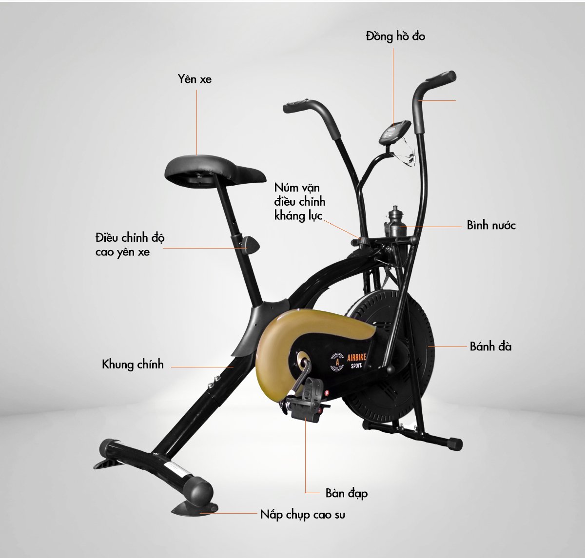 - Xe đạp tập thể dục AirBike sẽ hỗ trợ người sử dụng trong việc luyện tập chân, tập lưng, tập tay, tập hông, tập eo, tập cơ bắp, tập đùi, tập mông, nâng cao sức khỏe cho tim mạch, phòng ngừa các bệnh về cao huyết áp, hạn chế và loại bỏ béo phì.