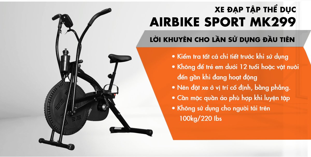 - Xe đạp tập AirBike Sport MK299 dùng cho gia đình, chịu được khối lượng người tập cho phép lên đến 100kg, sẽ phù hợp với nhiều đối tượng tập luyện.