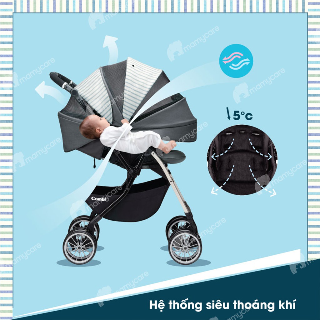 XE ĐẨY CHO BÉ COMBI MECHACAL HANDY 4 BÁNH QUAY TỰ ĐỘNG - MAMYCARE 𝑻𝒉𝒐̂𝒏𝒈 𝑻𝒊𝒏 𝑺𝒂̉𝒏 𝑷𝒉𝒂̂̉𝒎 - Bánh xe tự động quay 360̊ khi đảo chiều tay đẩy giúp Mẹ đẩy xe trơn tru, dễ dàng điều chỉnh góc quay của xe với cả hai chiều tay đẩy. - Ghế ngồi cao 55cm cách ly khói bụi, giảm nóng từ mặt đường. Mẹ cũng sẽ giao tiếp với Bé dễ dàng hơn ở khoảng cách này. - Lưng ghế được trang bị đệm lưới 3D giúp tản nhiệt tới 5°C cho bé thoáng mát suốt hè. - Màn chụp có chỉ số chống nắng lên tới UPF 50+ giúp chống 99% tia UV, bảo vệ bé tốt hơn trước ánh nắng hè. - Khung màn chụp chắc chắn, điều chỉnh được nhiều nấc khác nhau để mẹ có thể kéo màn chụp xuống phủ kín xe khi trời nắng hoặc kéo lên để bé có thể ngắm cảnh khi đi dạo. - Công nghệ tự động thu lưng ghế giúp xe đẩy có thể được gập gọn ngay cả khi lưng ghế vẫn ở độ ngả thấp nhất. Mẹ sẽ thao tác 1 tay thật nhanh chóng và gọn nhẹ. - Công nghệ EggShock được trang bị ở phần đệm đỡ đầu và phần hông giúp hấp thu toàn bộ chấn rung, bảo vệ Bé an toàn hơn. - Đệm Dacco tạo tư thế nằm chuẩn, chống cong vẹo cột sống, chống mỏi và tạo đường thở tối ưu cho bé, đặc biệt phù hợp với bé sơ sinh. - Bánh xe với kích thước lớn 140mm phù hợp với nhiều kiểu địa hình đường xá. Xe có thể đẩy êm và lướt nhẹ ngay cả trên những đoạn đường mấp mô - Bộ khung làm từ hợp kim nhôm dùng trong công nghiệp máy bay giúp xe nhẹ mà chắc chắn. - Lưng tựa điều chỉnh linh hoạt độ ngả từ 125° - 170° để bé có thể nằm, ngồi nhiều tư thế. - Giỏ đựng đồ tiện lợi có thể chứa tới 5kg.