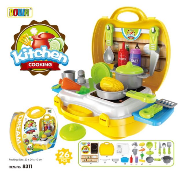 - Được làm từ chất liệu nhựa ABS cao cấp. - Thiết kế bề mặt nhẵn mịn không gây trầy xước da. - Thích hợp chơi theo nhóm, tính tương tác cao, kích thích sự sáng tạo và khả năng tư duy của bé. - Sản phẩm được đựng trong chiếc xe đẩy độc đáo. Có thể cất gọn gàng và mang đi chơi rất tiện lợi. - Bộ Xe Đẩy Dụng Cụ Nhà Bếp Bowa 8326 bao gồm 31 chi tiết: nồi, bếp, dao, củ quả.... Các thiết kế được mô phỏng giống thật trải nghiệm làm một đầu bếp chuyên nghiệp. - Giúp bé hình thành tính kiên nhẫn, tỉ mỉ và nâng cao kỹ năng giao tiếp, biết cách ứng xử thích hợp trong từng tình huống. - Được làm từ chất liệu nhựa ABS cao cấp, không độc hại, an toàn cho sức khỏe của bé khi chơi. - Sản phẩm được thiết kế sinh động, nhiều màu sắc, kích thích sự phát triển thị giác, kích thích sự vận động, khéo léo, phát triển tư duy và trí tưởng tượng của bé. - Sản phẩm trơn nhẵn, không góc cạnh, không làm tổn thương đến làn da nhạy cảm của bé. - Bộ đồ chơi giúp bé rèn luyện kĩ năng quản lý đồ dùng cá nhân cũng như tính ngăn nắp sau khi chơi.
