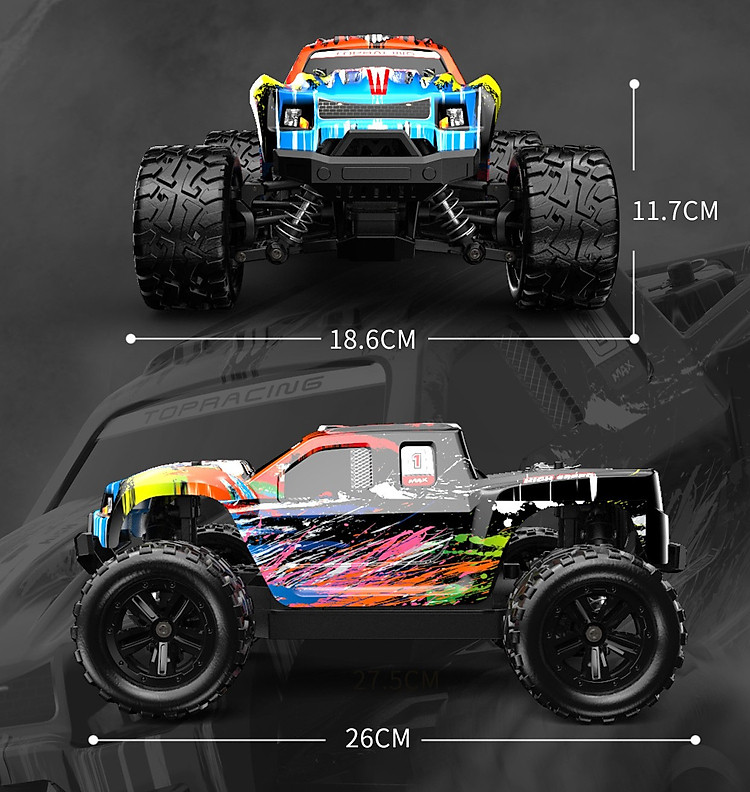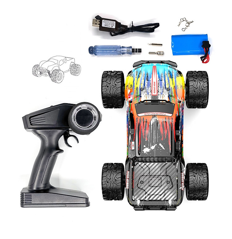 Mỗi hộp bao gồm: xe địa đình điều khiển x1, tay cầm điều khiển 2.4G x1, dây sạc USB x1, pin x1, sách hướng dẫn sử dụng x1