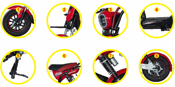 Chi tiết xe điện JVC eco S600i MayBach Giảm sóc dầu phía dưới yên xe Xe điện JVC eco S600i MayBach sở hữu cặp giảm sóc dầu lớn và êm ái nối liên phân yên xe và thân dưới, có khả năng chịu tải lên đến 170kg, giúp chiếc xe có thể vận hành qua các địa hình một cách êm ai. Phía dưới để chân là cụm động cơ công suất 250W với khả năng tăng tốc vượt trội, có thể đạt vận tốc tối đa lên điến 35km/h. Động cơ được thiết kế để chống nước hoàn hảo khi sử dụng trong điều kiện trời mưa. |