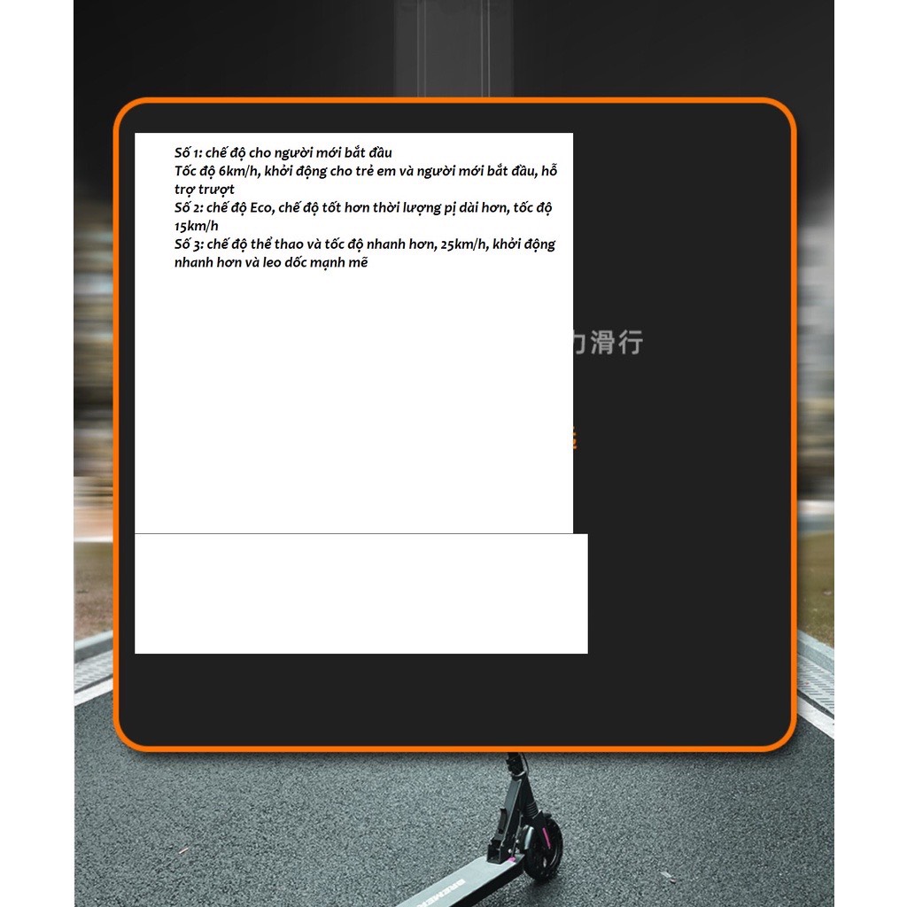 - Vật liệu chính : Hợp kim nhôm + ABS - Tốc độ 15-25km/h ( tả tối đa : 150kg )