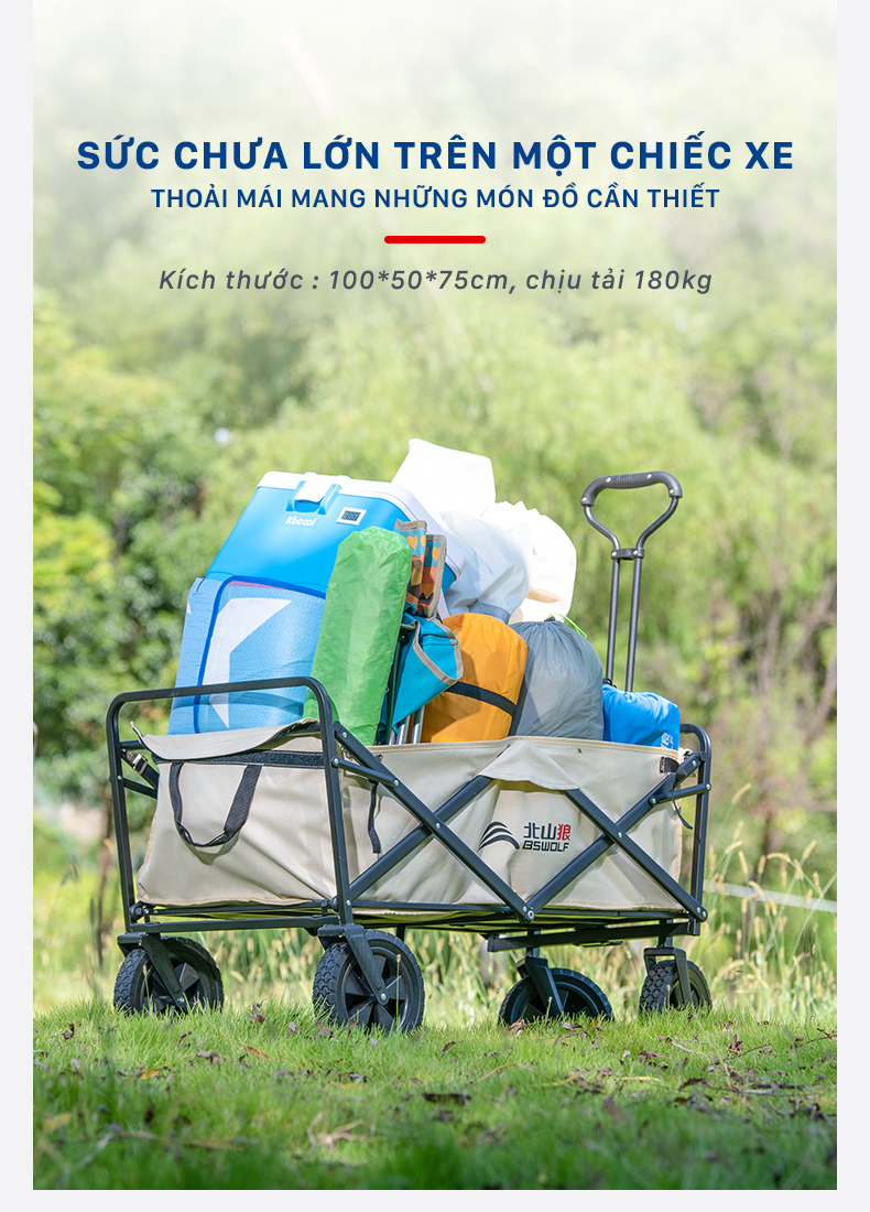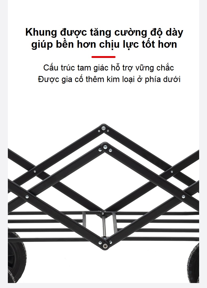 Khung xe kéo dã ngoại YZ010-2023 được làm từ các ống thép có ưu điểm nhẹ nhưng rất chắc chắn. Trọng tải tới 180kg, bạn thoải mái đựng đồ cắm trại như tăng, lều, bàn ghế… Bánh xe cao su đặc xoay 360 độ với các vòng bi trơn tru, giúp giảm lực cản, dễ dàng kéo đi.