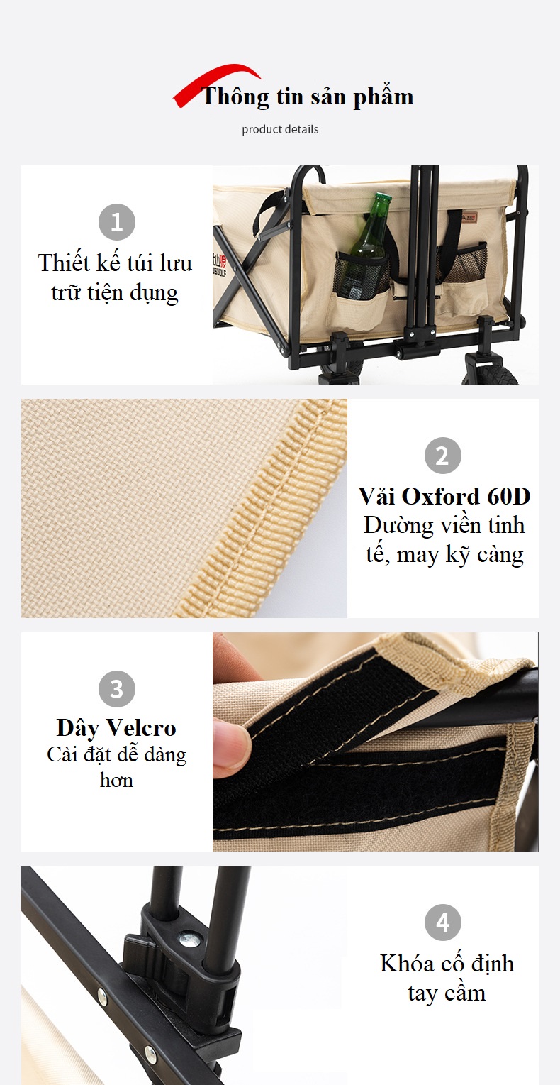 Tay cầm của xe đẩy xếp gọn có thể kéo dài, thu ngắn và có nút giữ cố định. Bên cạnh đó, vải của xe chở đồ dã ngoại có thể tháo rời. Rất tiện lợi cho việc tháo ra giặt giũ, vệ sinh. Nó còn được tích hợp vài túi nhỏ bên hông xe để tiện để những đồ nhỏ lặt vặt.