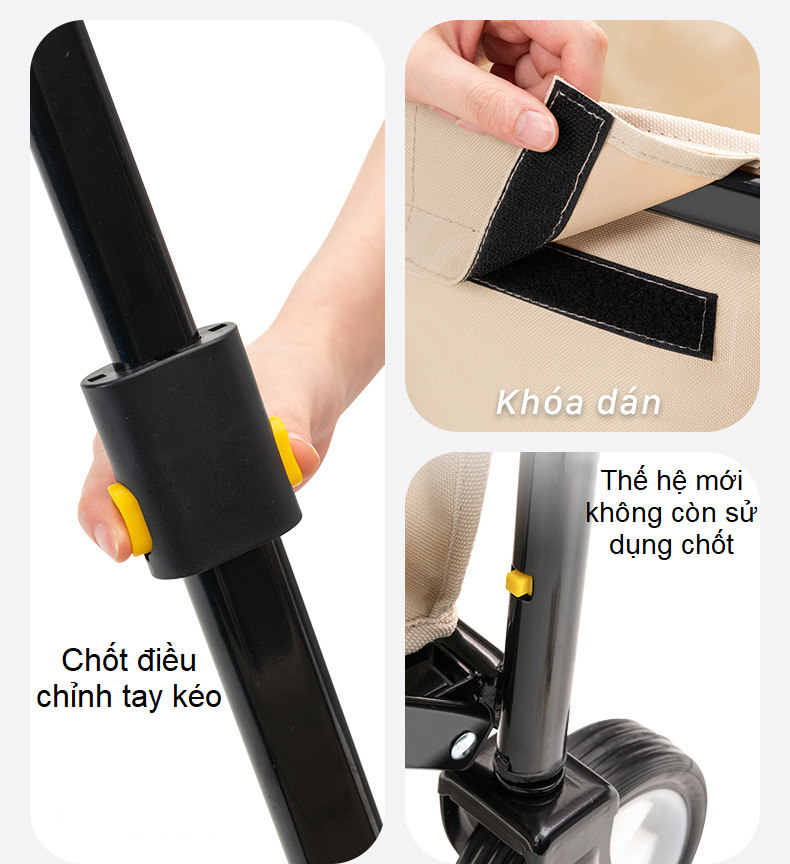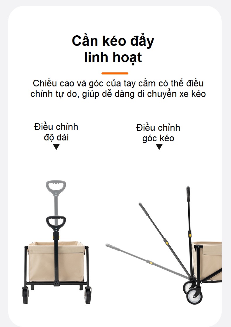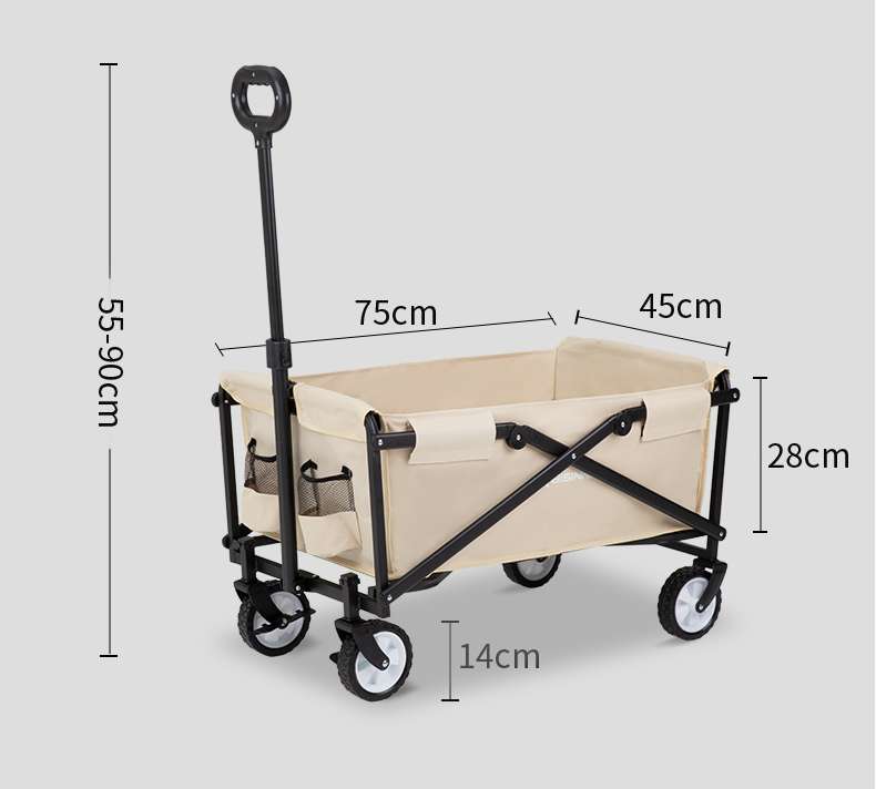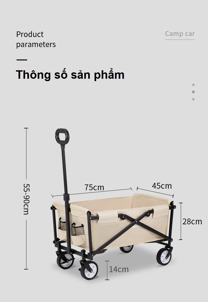 Tay cầm của xe đẩy xếp gọn có thể kéo dài, thu ngắn và có nút giữ cố định. Bên cạnh đó, vải của xe chở đồ dã ngoại có thể tháo rời. Rất tiện lợi cho việc tháo ra giặt giũ, vệ sinh. Nó còn được tích hợp vài túi nhỏ bên hông xe để tiện để những đồ nhỏ lặt vặt.