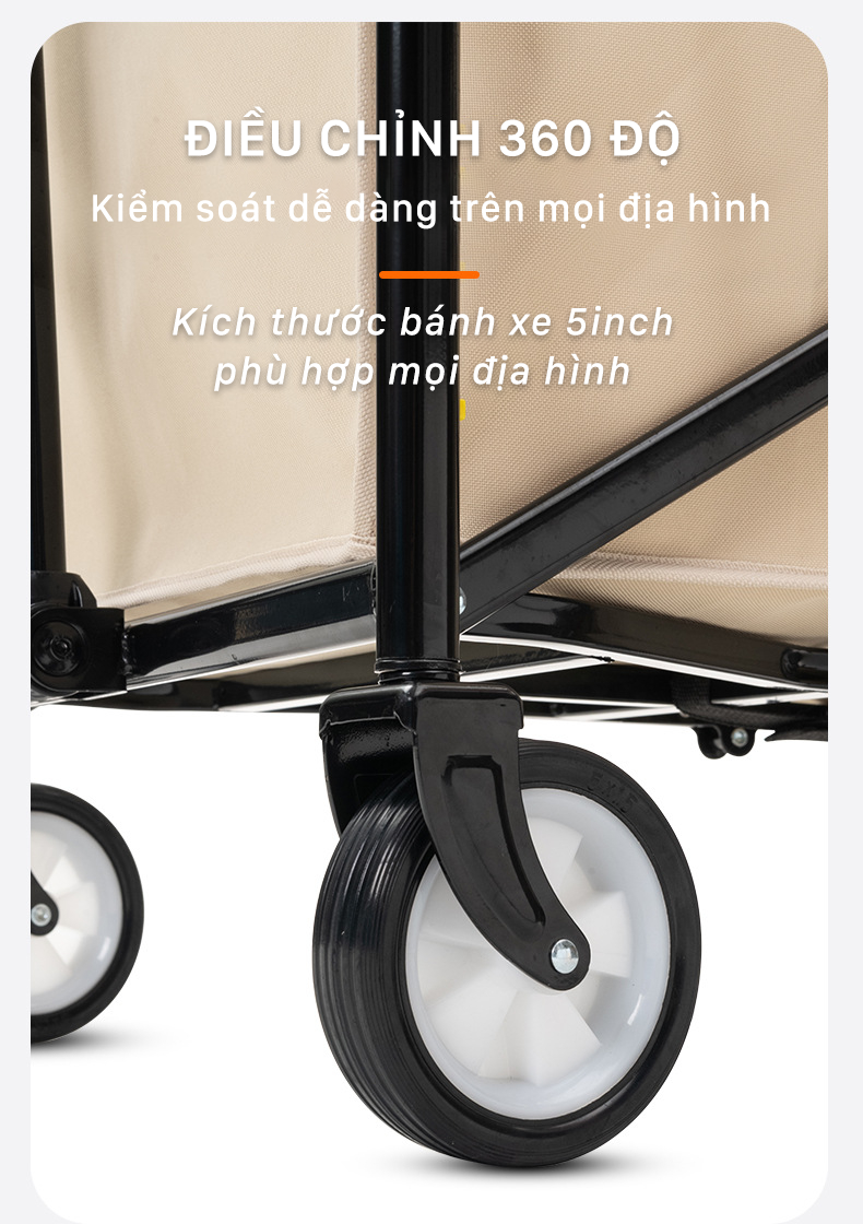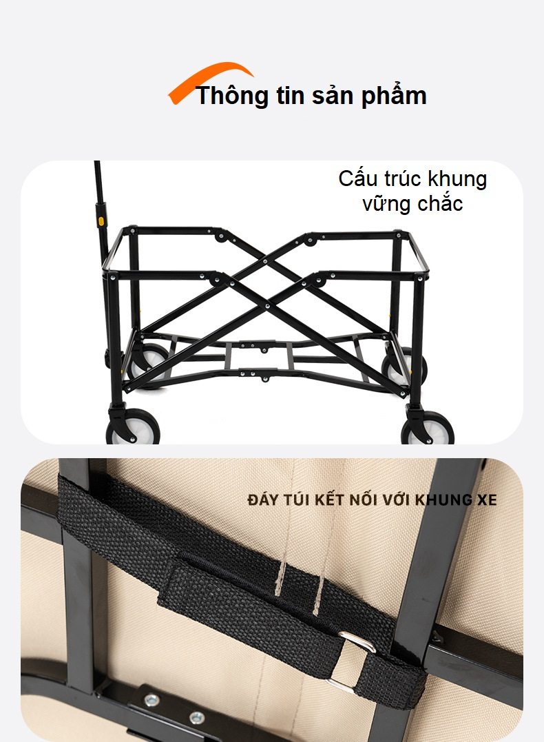 Khung xe kéo dã ngoại YZ015-2023 được làm từ các ống thép có ưu điểm nhẹ nhưng rất chắc chắn. Trọng tải tới 80kg, bạn thoải mái đựng đồ cắm trại như tăng, lều, bàn ghế… Bánh xe cao su đặc xoay 360 độ với các vòng bi trơn tru, giúp giảm lực cản, dễ dàng kéo đi.