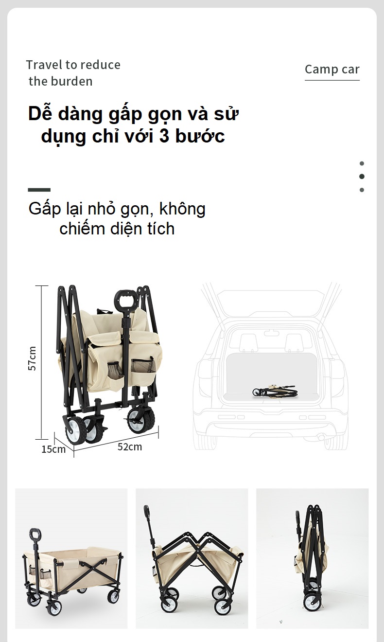 Xe Kéo Dã Ngoại Gấp Gọn YZ015-2023 là mẫu xe thiết kế mới giúp chuyến đi dã ngoại của bạn gọn nhẹ hơn. Với 4 bánh xe linh hoạt, các dụng cụ dã ngoại sẽ được kéo đi dễ dàng. Không phải tốn sức vất vả bê bàn, ghế, lều trại, bếp, đồ ăn, nước uống… Xe kéo được tháo lắp cực kì nhanh chóng, dễ dàng, tiết kiệm thời gian chỉ với vài thao tác đơn giản. Rất thích hợp với các bạn di chuyển bằng ô tô cá nhân.