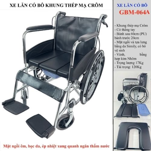 Khung thép mạ crom chắc chắn và bền bỉ Xe lăn thép có bô GBM-064A được trang bị khung thép mạ crom, mang lại độ bền và khả năng chịu lực vượt trội. Với thiết kế này, xe có khả năng chống gỉ sét và dễ dàng vệ sinh, giữ cho xe luôn như mới trong thời gian dài. Đây là một yếu tố rất quan trọng giúp xe lăn có thể sử dụng lâu dài trong môi trường thường xuyên tiếp xúc với nước. Mặt ngồi ép nhiệt bọc da, chống nước Mặt ngồi của xe được ép nhiệt bọc da, không chỉ giúp người dùng cảm thấy thoải mái mà còn dễ dàng vệ sinh. Lớp da này còn có khả năng chống nước giúp bảo vệ bề mặt ngồi khỏi các tác động của nước và các chất lỏng, tạo sự thoải mái và sạch sẽ trong suốt thời gian sử dụng. Bánh xe dễ di chuyển và linh hoạt Xe lăn Gia Bảo Minh GBM-064A được trang bị bánh sau 60 cm và bánh trước 20 cm, mang lại khả năng di chuyể nlinh hoạt và dễ dàng trên nhiều loại bề mặt khác nhau. Kích thước bánh lớn giúp xe di chuyển ổn đinh, phù hợp cho cả người sử dụng trong không gian nhà và ngoài trời. Tiện ích bô đi kèm và tải trọng lớn Xe được tích hợp bô đi kèm, rất tiện lợi cho người sử dụng trong những tình huống cần thiết, giúp tiết kiệm thời gian và công sức. Xe lăn này còn có tải trọng đến 120kg, phù hợp với nhiều đối tượng người sử dụng, từ người già đến người có thể trạng lớn. Với thiết kế chắc chắn, tính năng tiện và tải trọng lớn, xe lăn có bô GBM-064A là sự lựa chọn lý tưởng cho những ai cần sự hỗ trợ di chuyển. Hãy đến với Dr.Viet để sở hữu sản phầm này với giá ưu đãi và mang lại sự tiện lợi cho cuộc sống hằng ngày của bạn. Mức giá tốt cho một chiếc xe lăn có bô khung thép mạ Crom chắc chắn, bền bỉ, phù hợp sử dụng gia đình, phòng khám hoặc trung tâm chăm sóc sức khỏe. Số lượng có hạn - ưu tiên khách liên hệ sớm để được tư vấn và giữ hàng. Lưu ý khi sử dụng - Không vượt quá tải trọng cho phép - Kiểm tra độ chắc chắn trước khi sử dụng - Luôn khóa phanh khi lên/ xuống xe - Giữ vệ sinh và bảo quản thường xuyên Đối tượng sử dụng - Người cao tuổi cần chăm sóc tại nhà - Bệnh nhân sau phẫu thuật hoặc phục hồi chức năng - Phòng khám, bệnh viện, trung tâm điều dưỡng - Gia đình cần giường chăm sóc bệnh nhân tại nhà - Phụ nữ mang thai, sau sinh, phụ nữ sinh mổ - Người khuyết tật, người bại liệt, người bại não - Người mới phẫu thuật, người bệnh, sức khỏe yếu