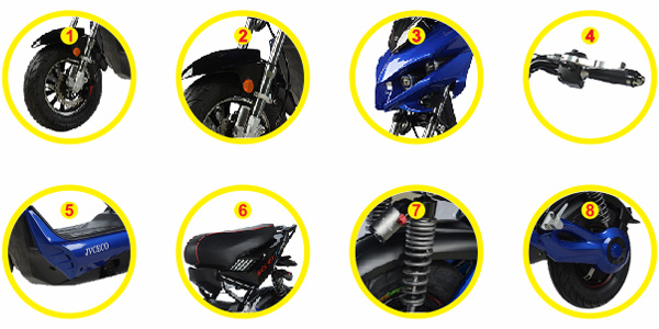 Bánh trước với vành đúc hợp kim Xe máy điện JVC eco Jeek No.1 sở hữu bánh trước với vành đúc hợp kim là zăng 12inh độ bền cao, được bao quanh là lốp cao su có ruột, có khả năng tiếp xúc hoàn hảo với các bề mặt. Ở tâm bánh xe là thắng đĩa an toàn được đồng bộ với tay lái phía trên giúp người sử dụng dễ dàng làm chủ tốc độ của xe khi đang vận hành. Cụm bánh trước được nối với thân xe thông qua một cặp giảm sóc dầu, giúp người xe có thể vận hành qua các dạng địa hình một cách dễ dàng. |