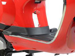 Để chân với thiết kế rộng rãi Xe máy điện JVC eco Limited Vespa có để chân được đặt ở một khoảng cách phù hợp, được nhà sản xuất tính toán một cách dễ dàng để kết hợp cùng với yên xe và tay lái tạo nên 3 điểm tiếp xúc an toàn và bảo vệ cho cột sống của người vận hành. Trên bề mặt để chân là một lớp nhựa chống chầy xước, được thiết kế các g nhỏ chống trơn trượt trên bề măt, với diện tích rộng rãi để có thể để được thêm đồ dùng và cuối cùng là viền bạc sang trong nối dài theo phần mặt nạ toát lên sự sang trọng.