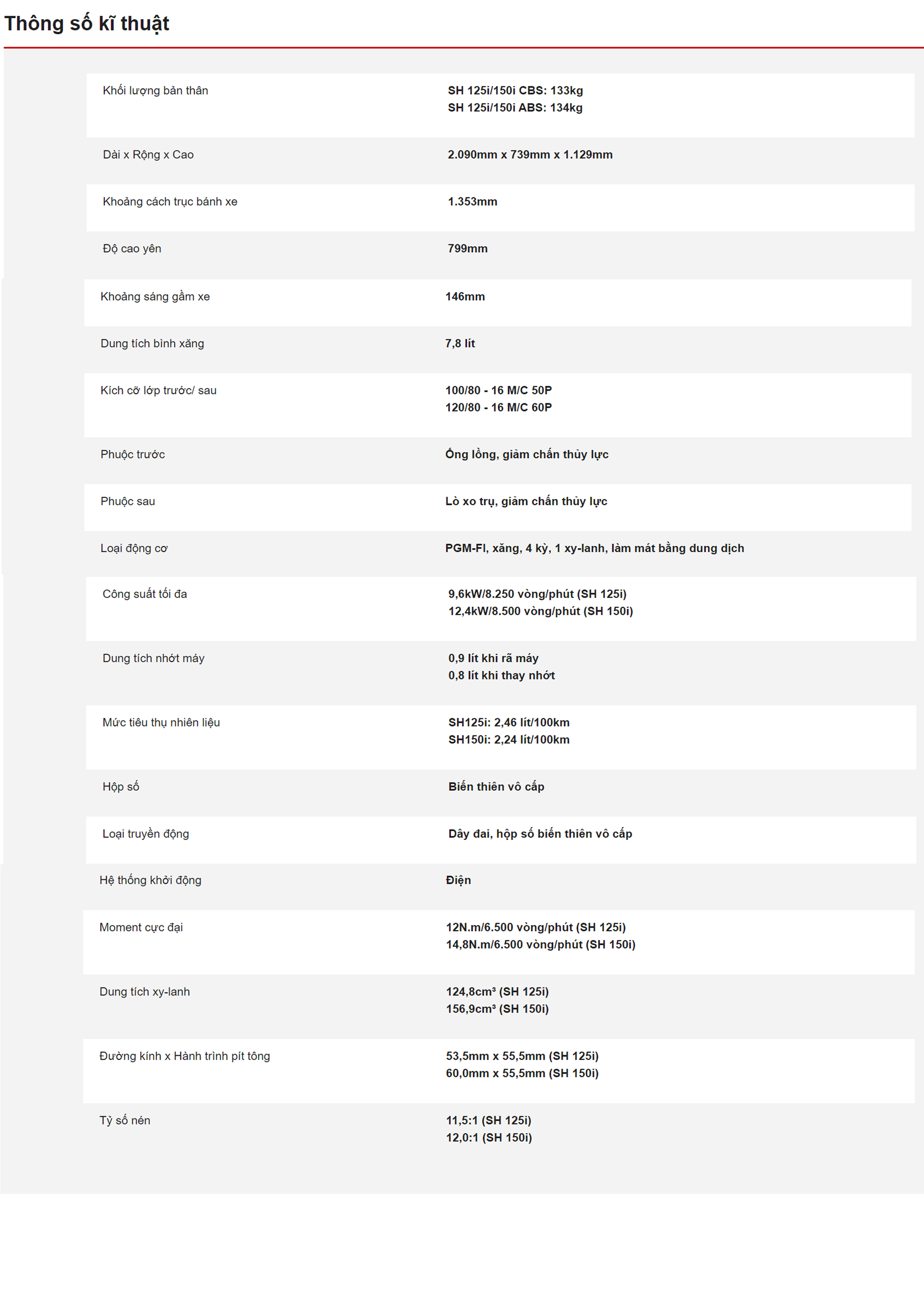 (*) Chức năng được trang bị trên phiên bản SH150i.