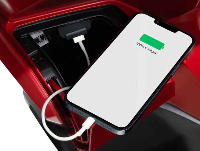 VARIO 160 sở hữu 2 hộc chứa đồ phía trước rộng rãi, đặc biệt hộc chứa đồ bên trái được trang bị nắp che tích hợp cổng sạc USB loại A tiện lợi với công suất tối đa là 10,5W (5V – 2,1A) cho phép sạc pin điện thoại trong khi đang di chuyển.