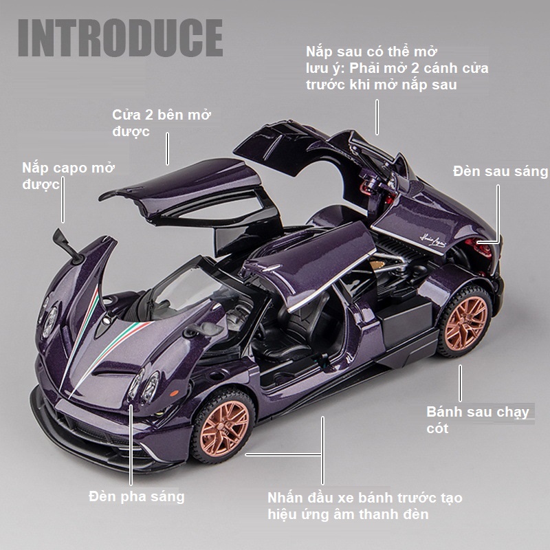 Xe mô hình tĩnh Pagani được thiết kế như thật với những đường nét mô phỏng chi tiết theo đúng tỷ lệ 1:32 so với phiên bản xe thật, thân xe được sơn tĩnh điện một cách tinh tế theo quy trình tự động đảm bảo các tiêu chuẩn về chất lượng nghiêm ngặt của nhà sản xuất để tạo ra các sản phẩm hoàn hảo rất phù hợp để trưng bày ở phòng khách, phòng làm việc, với kích cỡ nhỏ nhắn, vừa phải.