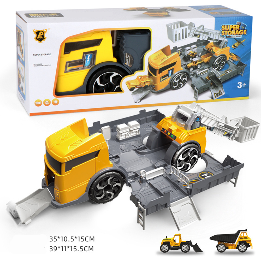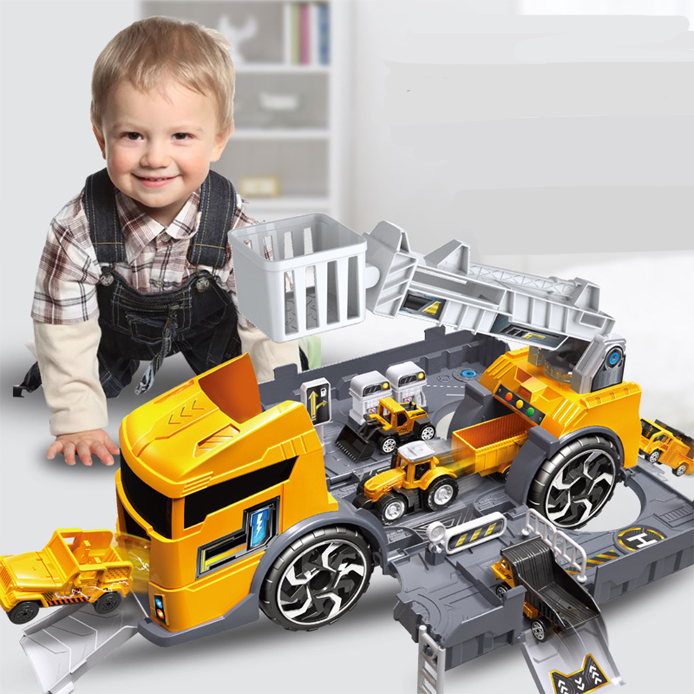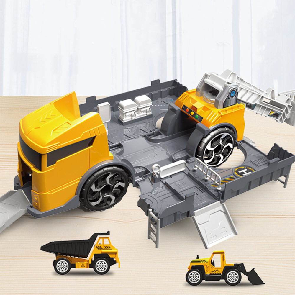 Bộ vàng gồm 1 xe có cần cẩu to, 1 xe xúc, 1 xe chứa vật liệu, thanh trượt đi lên