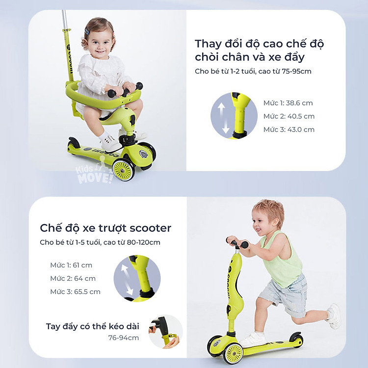 Hệ thống tăng giảm chiều cao 3 mức độ tương ứng với mỗi chế độ xe phù hợp cho bé đang trong giai đoạn phát triển. Bé khoảng 1-2 tuổi, chiều cao từ 82cm-95cm có thể sử dụng xe tròn tập đi hoặc cần đẩy. Chiều dài cần đẩy dao động từ 76cm - 94cm để tư thế đẩy của cha mẹ được thuận lợi và dễ dàng nhất. Bé khoảng 1-6 tuổi với chiều cao từ 85cm-120cm có thể trượt xe scooter. Xe có khả năng thay đổi kích thước giúp cha mẹ không còn phải lo lắng khi chọn mua xe phù hợp với chiều dài cơ thể con.