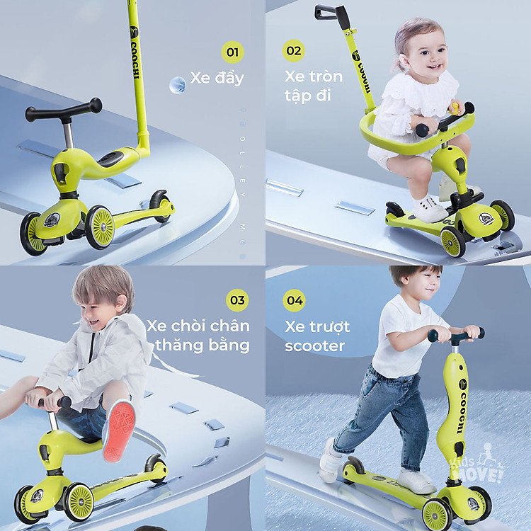 Cooghi Velo Kids V4 có thiết kế 4 loại xe trong 1, có thể đồng hành xuyên suốt tuổi thơ con với 4 chức năng vượt trội: xe chòi chân, xe trượt scooter, xe đẩy, xe tròn tập đi. Chế độ xe tròn tập đi dành cho bé từ 8 tháng-2 tuổi, xe chòi chân dành cho bé 1- 3 tuổi, xe trượt scooter dành cho bé từ 2-6 tuổi và bé từ 8 tháng có thể ngồi để cha mẹ đẩy ra ngoài. Một chiếc xe có thể sử dụng với bốn mục đích khác nhau, thích hợp với mọi giai đoạn phát triển của trẻ. Với chiếc xe scooter đa năng này, bé vừa thỏa thích vận động, có thể thay đổi nhiều cách chơi vừa giúp cha mẹ tiết kiệm chi phí và không gian lưu trữ trong nhà.