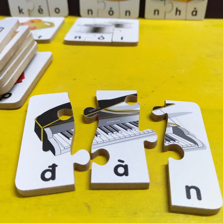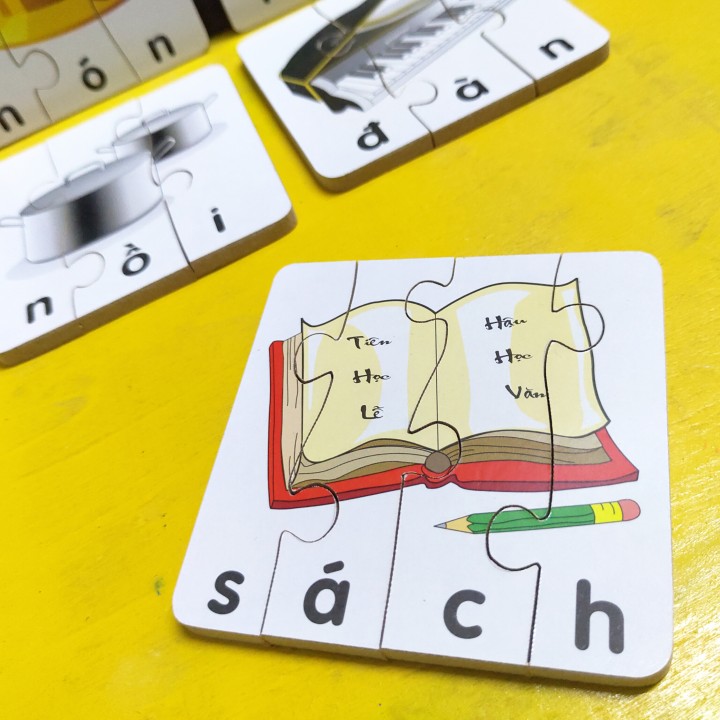 Gồm 15 tranh khác nhau với các chủ để khác nhau, mỗi tranh có khoảng 3-4 mảnh ghép, Thông tin trên sản phẩm là tiếng Việt, có ghép các chữ tiếng Việt để tạo thành 1 từ có nghĩa tượng ứng với hình ảnh ghép trong tranh.