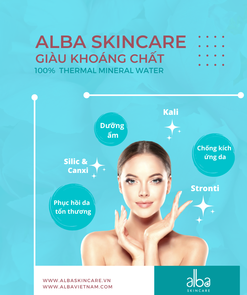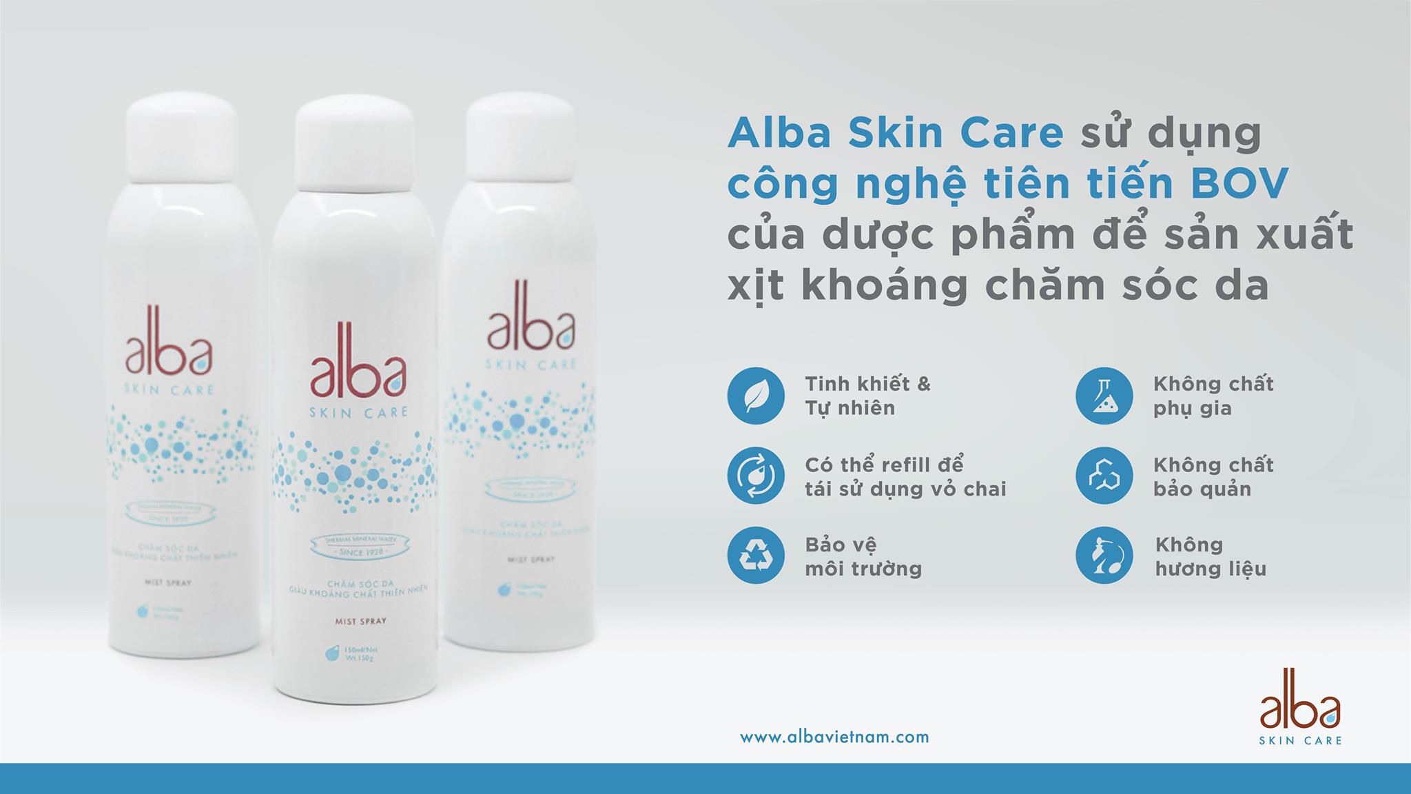 Xịt khoáng dưỡng ẩm và bảo vệ da Alba là một sản phẩm chăm sóc da được sản xuất từ nguồn nước khoáng nóng Thanh Tân, nơi có nhiệt độ lên tới 68 độ C. Nguồn nước khoáng nóng này chứa nhiều khoáng chất và các dưỡng chất tự nhiên, được tự phun trào từ độ sâu hơn 1200m tại chân dãy Trường Sơn, thuộc Tỉnh Thừa Thiên Huế.
