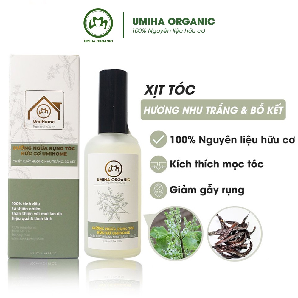 XỊT KÍCH THÍCH MỌC TÓC NHANH DÀI HƯƠNG NHU TRẮNG VÀ BỒ KẾT HỮU CƠ UMIHOME I/ GIỚI THIỆU VỀ XỊT KÍCH THÍCH MỌC TÓC: • Xịt kích mọc tóc Hương Nhu Trắng và Bồ Kết hữu cơ Umihome 100% nguyên chất là sản phẩm của công ty Umiha Vietnam. Công ty Umiha Vietnam sở hữu thương hiệu “Umiha Organic - 100% nguyên liệu hữu cơ”. Tất cả các sản phẩm của Umiha Organic đều được sử dụng 100% nguyên liệu được chứng nhận Hữu Cơ (Certificate Organic by ECOCERT (Pháp) và ISO 9001.