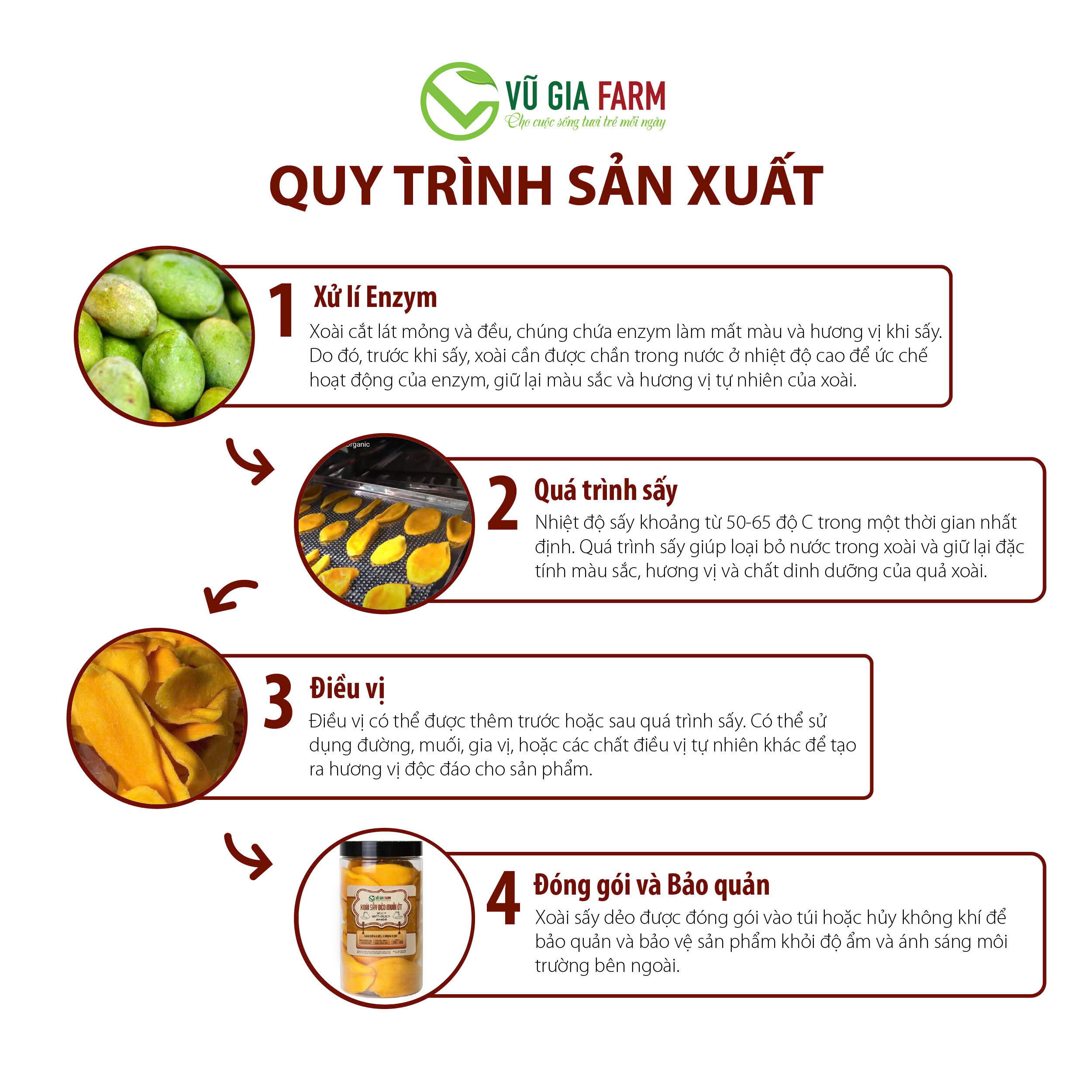 Với quy trình sản xuất ở nhiệt độ cao giúp giữ lại được màu sắc cũng như hương vị tự nhiên của xoài cũng như kết hợp với các gia vị khác tạo nên được sự độc đáo cho sản phẩm. Xoài sấy dẻo được đóng gói vào túi hoặc huỷ không khí để bảo quản và bảo vệ sản phẩm khỏi độ ẩm và ánh sáng môi trường bên ngoài.