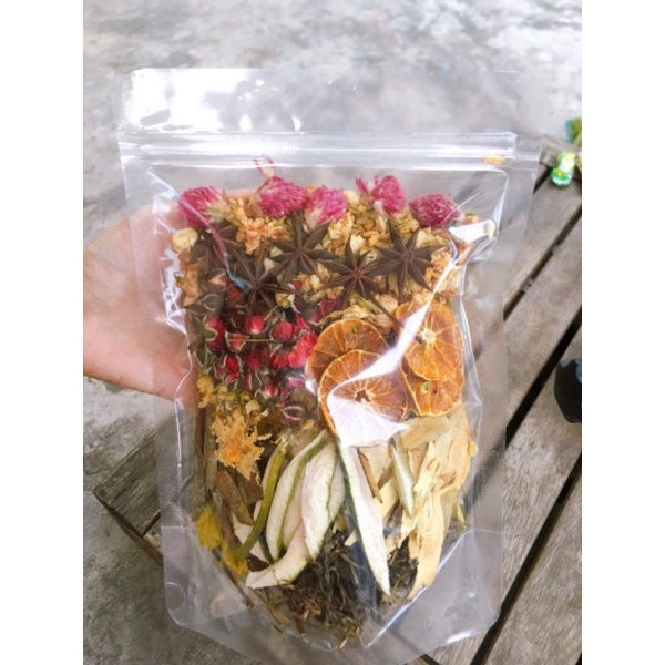 XÔNG MẶT THẢO MỘC THÀNH PHẦN: - Tinh dầu chanh: làm dịu mát làn da, hồi phục sức khoẻ - Cây sim: Làm mát da, tẩy tế bào chết, tái tạo làn da mới tươi trẻ hơn. - Bông cúc, hoa hồng: có công dụng làm mát da và thư giãn. Chống hiện tượng viêm lỗ chân lông ở da - Hương thảo: kích thích, làm giảm sư sưng tấy, đau nhứt của mụn trứng cá. - Kinh giới tía tô, cam nôn: có tác dụng làm dịu mát da, phục hồi sức khoẻ - Cỏ xạ hương, lá ngải cứu, lá bạc hà: Làm sạch da, giải độc tố và làm làn da tươi tắn, khoẻ mạnh, hồng hào - Cam khô: cung cấp Vitamin C giúp da trắng hồng - Nụ hoa Lavender: thư giãn CÔNG DỤNG: - Làm sạch hiệu quả lỗ chân lông: Bạn có biết rằng một trong những nguyên nhân chính gây ra mụn đó chính là tắc lỗ chân lông. Việc rửa mặt hàng ngày chỉ giúp loại bỏ lớp bụi bẩn, dầu dư thừa trên bề mặt da chứ không thể làm sạch lỗ chân lông từ sâu bên trong được, do đó xông mặt là phương pháp hữu hiệu giúp bạn làm sạch lỗ chân lông và làm mềm lớp tế bào chết trên bề mặt da - Hỗ trợ điều trị các loại mụn hiệu quả: mụn đầu đen, mụn ẩn, mụn trứng cá,…. - Kích thích đến các mao mạch trong da, làm máu đến da nhiều hơn, cho bạn làn da hồng hào, tươi trẻ - Đồng thời còn kích thích sản sinh collagen, tăng cường đàn hồi cho da - Nếu kết hợp việc xông mặt với các loại thảo dược, tinh dầu từ thiên nhiên thì còn giúp bạn thư giãn HƯỚNG DẪN SỬ DỤNG: -Tẩy trang, rửa mặt sạch - Cho một nhúm nhỏ thảo mộc vừa đủ vào nồi đun sôi 5 phút. Đợi sôi lên hẳn và nhấc xuống bắt đầu xông. - Trùm một chiếc khăn bông lên đầu, kề sát mặt vào tô nước nóng đang bốc hơi. -Sau 15-20 phút rửa mặt và lau lại bằng nước mát hoặc nước hoa hồng giúp se khít lỗ chân lông. Luư ý: Nguyên nhân chính gây ra mụn chính là viêm tắc lỗ chân lông, do đó việc xông hơi da mặt để loại bỏ bụi bẩn, bã nhờn ẩn sâu trong lỗ chân lông là rất cần thiết. Tuy nhiên da mụn lại là làn da đã bị tổn thương và khá nhạy cảm, do đó khi bị mụn các bạn không nên xông mặt thường xuyên mà chỉ nên thực hiện 2-3 lần/ 1 tuần mà thôi. Hơn nữa nên kết hợp việc xông mặt cùng các loại thảo dược thiên nhiên an toàn cho da, tránh cho vào nước xông mặt những sản phẩm có thành phần hóa chất. Khi sử dụng thuốc bắc sử dụng xông mặt sẽ giúp đẩy nhanh liệu trình, sạch mụn tan tâm nhanh chóng. ☎️ Mọi thắc mắc liên hệ Hà qua facebook/zalo/sđt: 0979281584