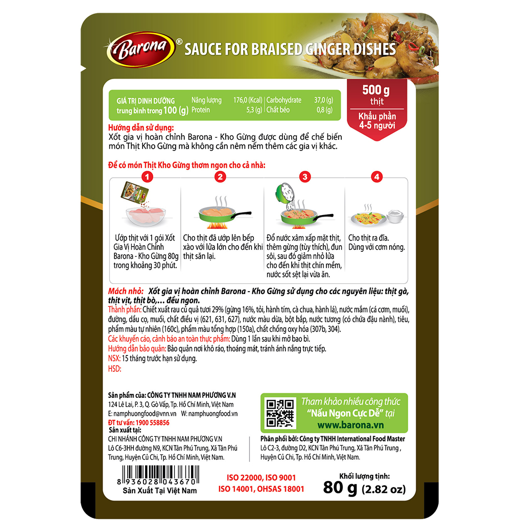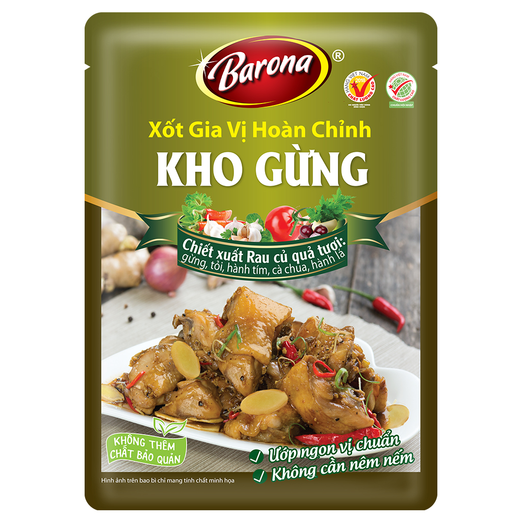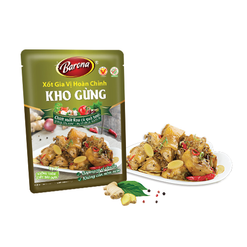 Xốt Gia Vị Hoàn Chỉnh Barona Kho Gừng 80g là công thức phối trộn độc đáo giữa CHIẾT XUẤT RAU CỦ QUẢ TƯƠI như hành, tỏi, me, cà chua…cùng các loại gia vị truyền thống được chọn lọc, đem đến món ngon chuẩn vị chỉ trong tích tắc mà KHÔNG CẦN NÊM NẾM thêm bất kỳ gia vị nào khác.