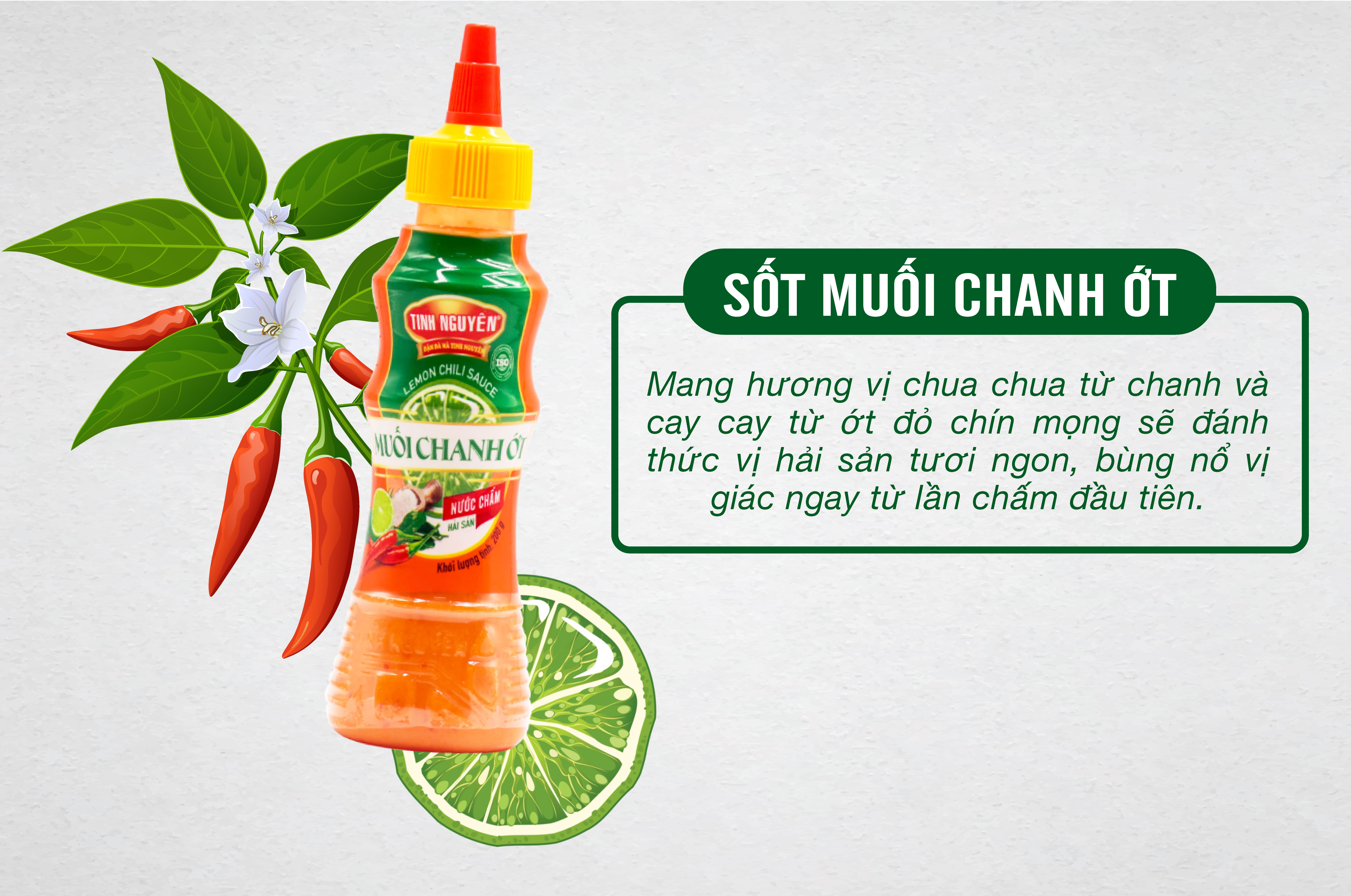 Một chén sốt chấm Muối ớt chanh Tinh Nguyên mang hương vị chua chua từ chanh và cay cay từ ớt đỏ chín mọng sẽ đánh thức vị hải sản tươi ngon, bùng nổ vị giác ngay từ lần chấm đầu tiên.