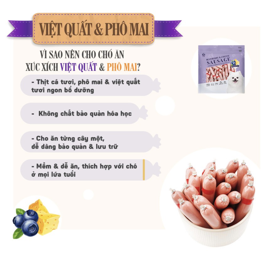 - Xúc xích phô mai & Việt quất – Thức ăn huấn luyện bổ dưỡng chất lượng cao dành cho chó: - Làm từ cá tươi, việt quất và phô mai - Giúp tăng cường khả năng tiêu hoá, hấp thụ dưỡng chất, chăm sóc da lông - Hàm lượng muối thấp giúp bảo vệ sức khỏe thú cưng - Nói không với chất bảo quản và các loại bột màu nhân tạo - Giàu Protein, Canxi, Vitamin A, B2… - Hương vị hấp dẫn, kích thích vị giác giúp chó ngon miệng hơn - Xúc xích mềm mịn, phù hợp cho chó ở mọi lứa tuổi