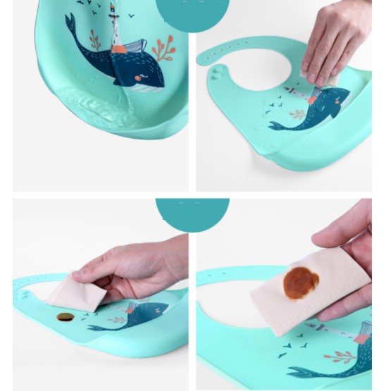 Yếm Ăn Dặm Có Máng Silicon nguyên chất, mềm dẻo nhẹ nhàng chống bám bẩn cho bé yêu. Chất liệu silicon an toàn không có BPA/PVC, Silicon mềm mại, Có nhiều nút bấm thay đổi độ rộng để sử dụng cho mọi lứa tuổi Có thể gấp gọn nhỏ dễ dàng mang theo mọi nơi Thiết kế máng khoa học, thức ăn mọi hướng sẽ rơi xuống máng Màu sắc bắt mắt, dễ vệ sinh Tiện lợi cho mẹ Rất nhiều hình động vật đáng yêu cho các mẹ lựa chọn