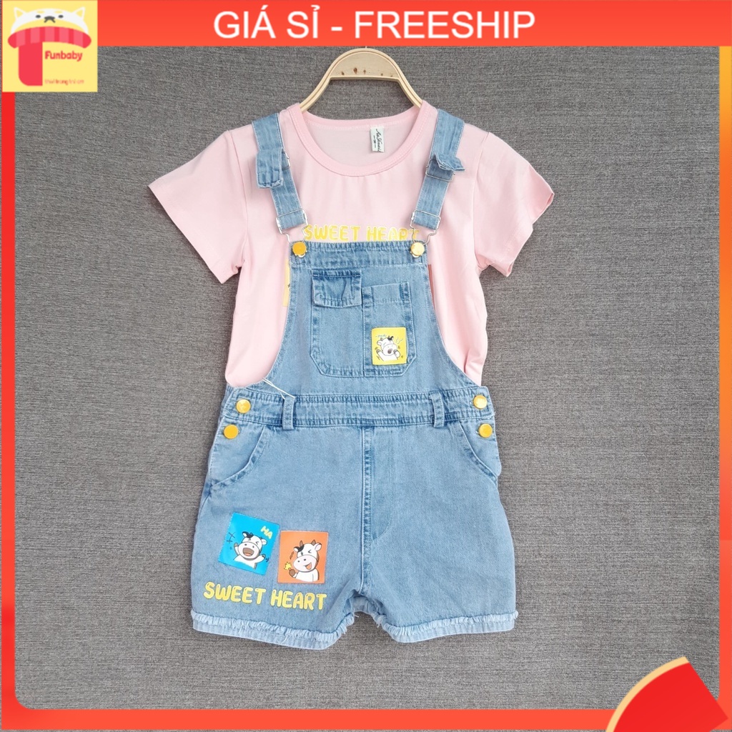 Thời trang trẻ em & trẻ sơ sinh > Quần áo bé gái > Đồ liền thân || Yếm bò cho bé gái cộc tay 5-12 tuổi rời hình bò sữa và chữ SWEET, Set yếm jean trẻ em khỏe khoắn thời trang