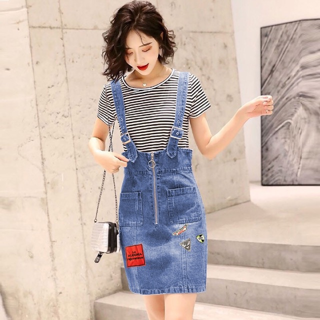 Yếm jean nữ wash cào phối dây kéo logo xinh