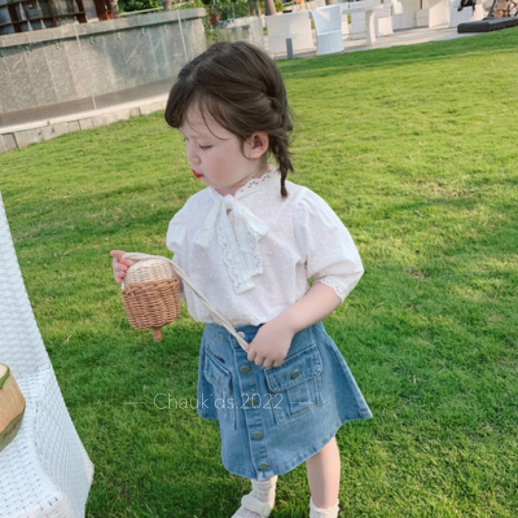 Yếm váy jean cúc dọc kèm áo trắng chất boy cổ nơ tiểu thư cho bé gái