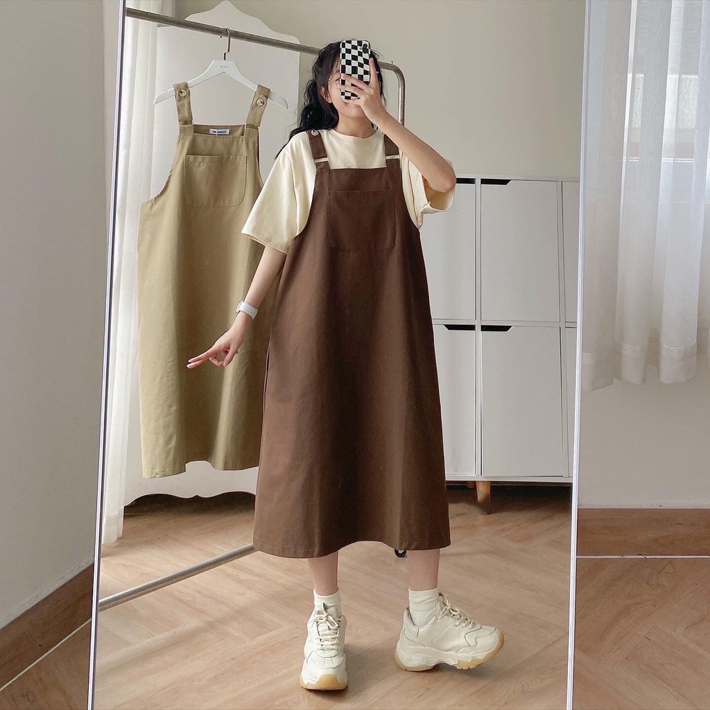 Yếm Váy Kaki Hàn Quốc Thiết Kế Basic 2 Dây Bản To Váy Yếm Dài From Rộng Dáng Suông BEGAI Có 2 Màu Nâu Và Be 7192