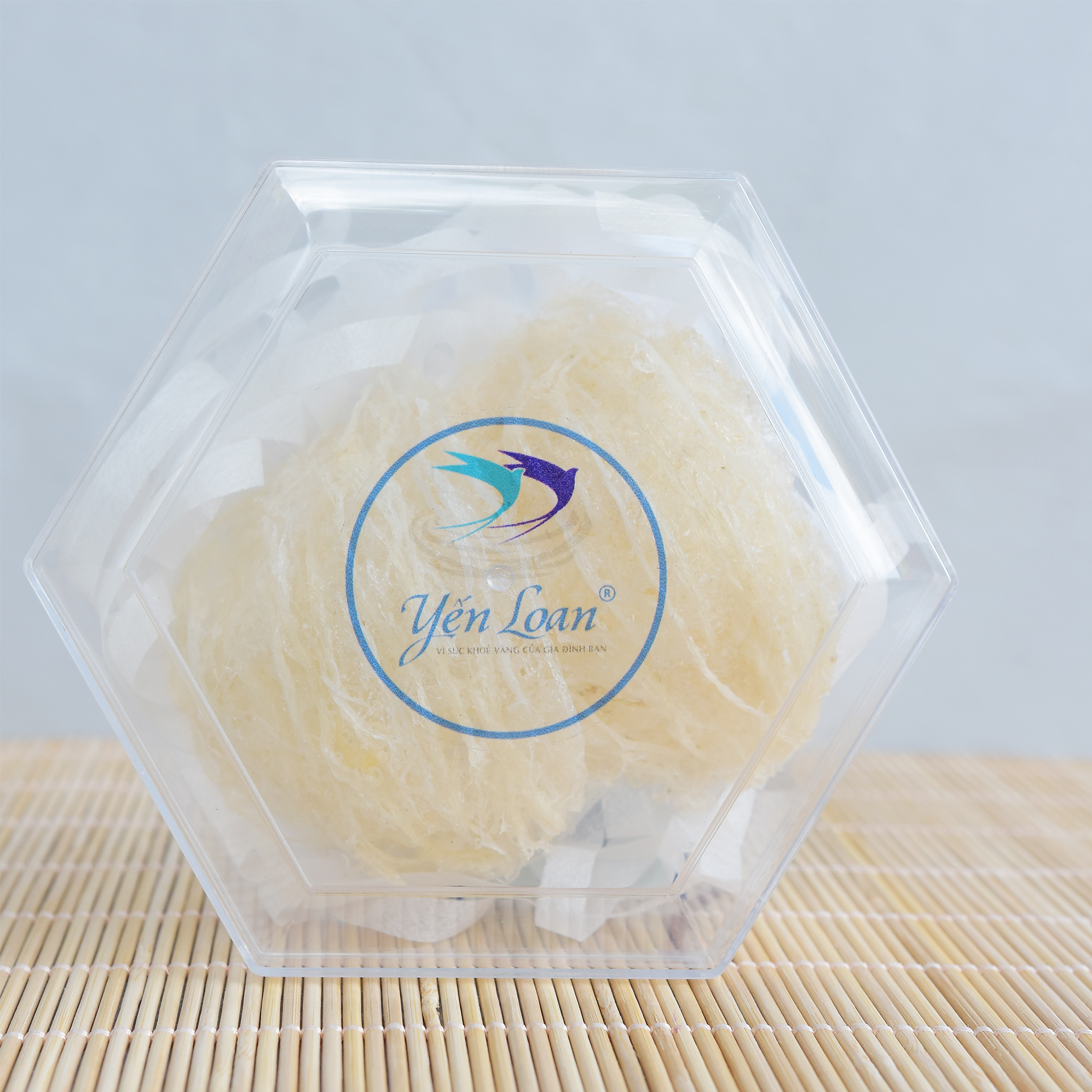 Mô tả sản phẩm: Yến sào Yến Loan không tẩm đường, không pha trộn tạp chất, không sử dụng bất cứ hóa chất tẩy trắng hay tạo mùi trong quá trình làm sạch. Nguyên liệu là những tổ yến tinh chế gồm những tổ yến, nhiều lông. Tổ yến sau khi khai thác được người thợ Yến Loan rửa sạch với nước đã xử lý khử trùng qua tia cực tím, loại bỏ lông yến và tạp chất bằng phương pháp nhặt khô thủ công, đảm bảo giữ được tối đa các khoáng chất có trong tổ yến. Thành phẩm là những tổ yến to, sợi yến to và dài được nhiều khách hàng tin tưởng làm quà biếu gia đình, người thân.