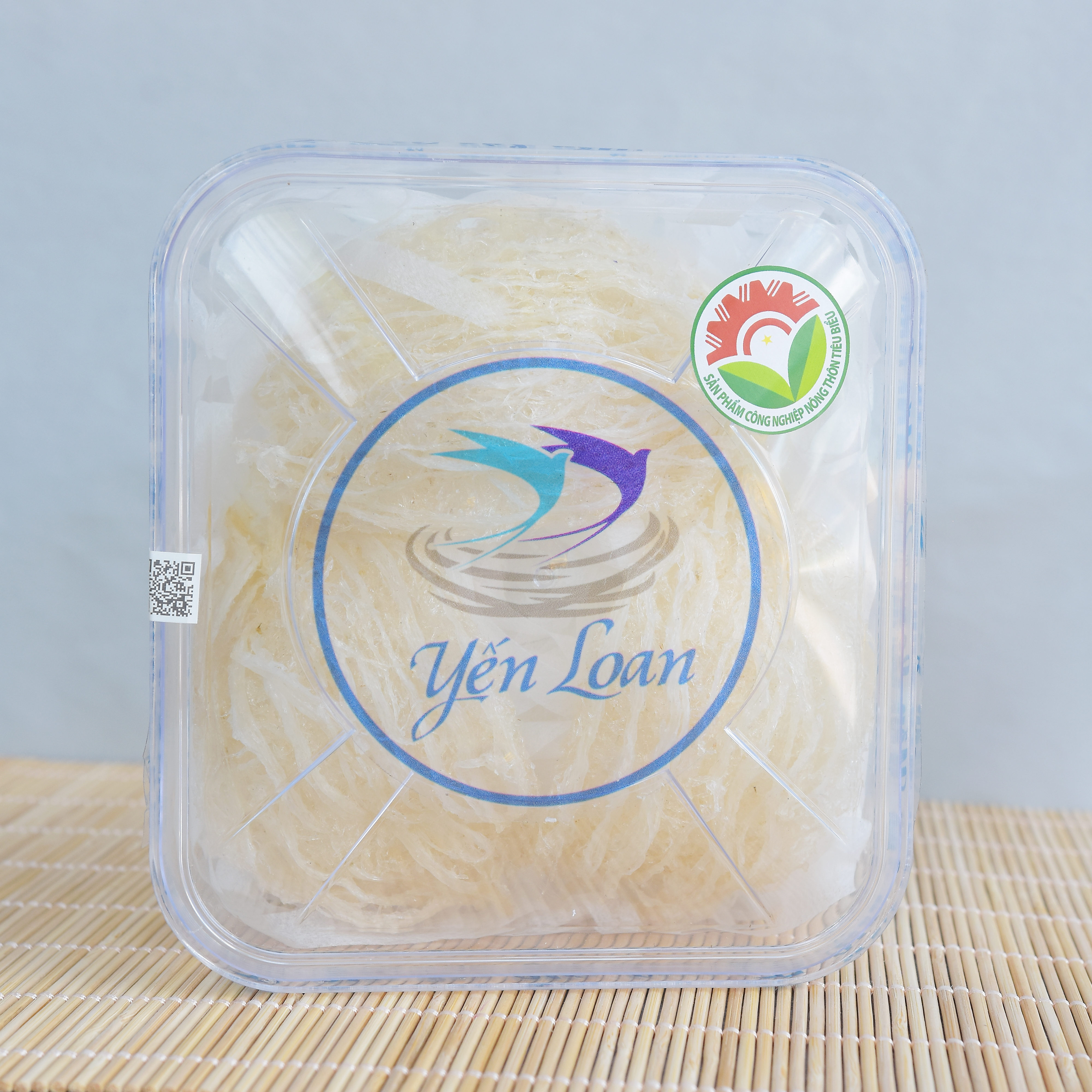 Mô tả sản phẩm: Yến sào Yến Loan không tẩm đường, không pha trộn tạp chất, không sử dụng bất cứ hóa chất tẩy trắng hay tạo mùi trong quá trình làm sạch. Nguyên liệu là những tổ yến tinh chế gồm những tổ yến, nhiều lông. Tổ yến sau khi khai thác được người thợ Yến Loan rửa sạch với nước đã xử lý khử trùng qua tia cực tím, loại bỏ lông yến và tạp chất bằng phương pháp nhặt khô thủ công, đảm bảo giữ được tối đa các khoáng chất có trong tổ yến. Thành phẩm là những tổ yến to, sợi yến to và dài được nhiều khách hàng tin tưởng làm quà biếu gia đình, người thân.