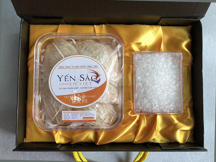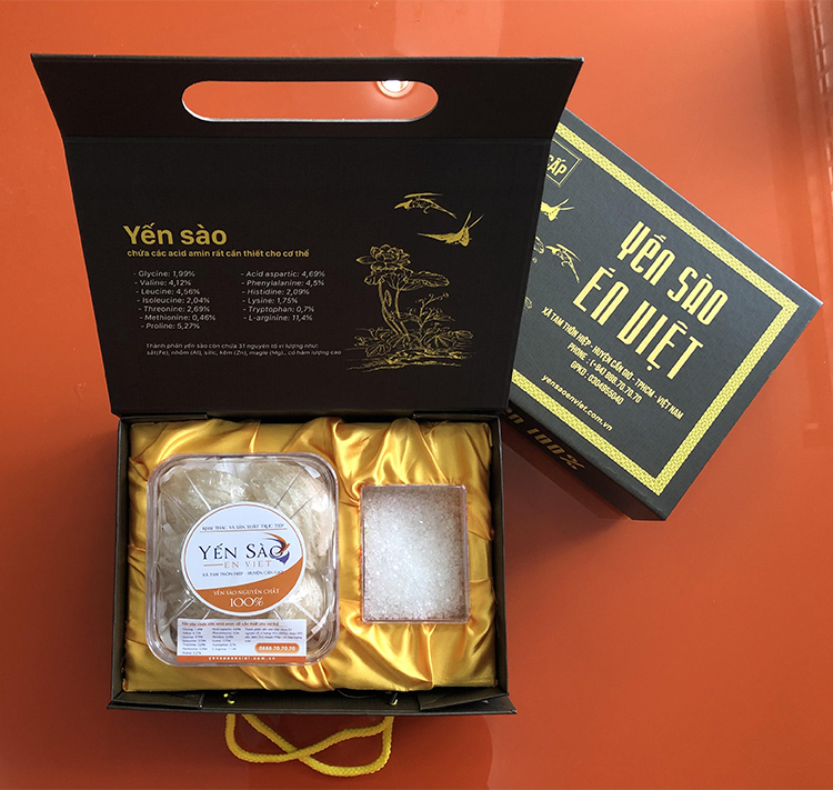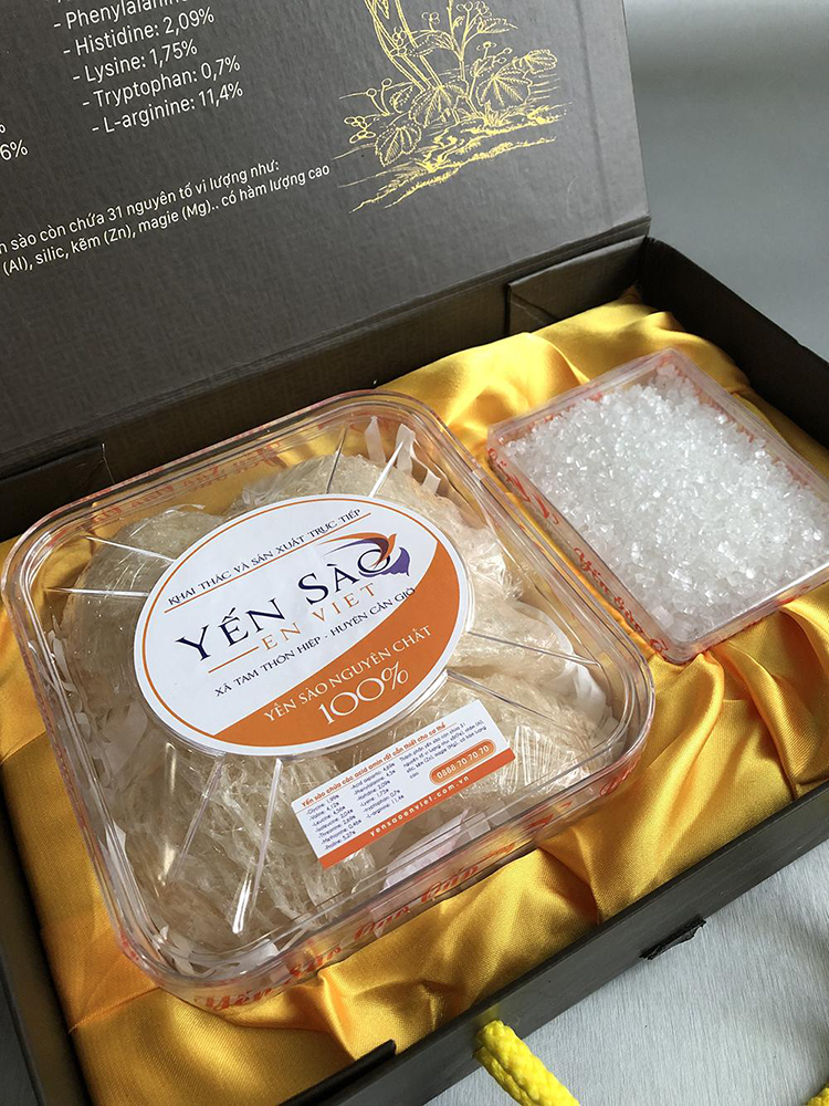 Đặc điểm: Màu sắc: Màu trắng ngà Hình dạng: Tạo hình tổ yến đẹp, đều nhau theo khuôn sẵn có hình dạng tai yến. Mùi: Tanh nhẹ đặc trưng. Vị: Không có vị. Quy trình thành phẩm: Công đoạn sơ chế: Tổ yến thô sẽ được ngâm trong nước lọc cho mềm, đến khi sợi yến tơi ra để lông yến có thể tách ra khỏi sợi, loại bỏ tạp chất qua quá trình rửa nước sạch. Tùy theo độ dày, mỏng của yến sào mà thời gian ngâm kéo dài khoảng 20-25 phút. – Công đoạn nhặt lông và loại bỏ tạp chất: Trải qua bước sơ chế đầu tiên, yến sào sẽ được các thợ yến tỉ mỉ nhặt sạch từng chiếc lông tơ nhỏ và các tạp chất, làm sạch tối đa theo tiêu chuẩn chất lượng. – Công đoạn đóng khuôn và sấy khô: Sản phẩm sẽ được tiến hành đóng thành miếng theo khuôn sẵn có hình dạng tổ yến, cuối cùng là trải qua quy trình sấy khô tự nhiên. Quy trình tinh chế hoàn toàn thủ công, tuyệt đối không dùng hóa chất tẩy lông, tẩy trắng, đảm bảo tuân theo các tiêu chuẩn về an toàn vệ sinh thực phẩm. Công Dụng : - Ông bà ăn yến để luôn khỏe mạnh, minh mẫn và sống lâu trăm tuổi. - Bố ăn yến để tiếp thêm “năng lượng”, để luôn là trụ cột vững chắc của cả nhà. - Yến sào giúp mẹ luôn trẻ, khỏe, đẹp. - Bé ăn yến để mau lớn, thông minh, học giỏi. Ưu điểm: Tiện lợi để sử dụng chế biến ngay không cần phải qua công đoạn nhặt lông và làm sạch, tiết kiệm thời gian và lượng hao hụt trong quá trình xử lý. Tạo hình tổ yến đẹp, đều nhau. Nhược điểm: Sản phẩm cần phải tiến hành sơ chế làm sạch lông trước khi chế biến. Chỉ tiêu chất lượng: Yến nguyên chất: 100%, độ ẩm: 0%, không chất bảo quản, không chất tẩy rửa, không chất độn.
